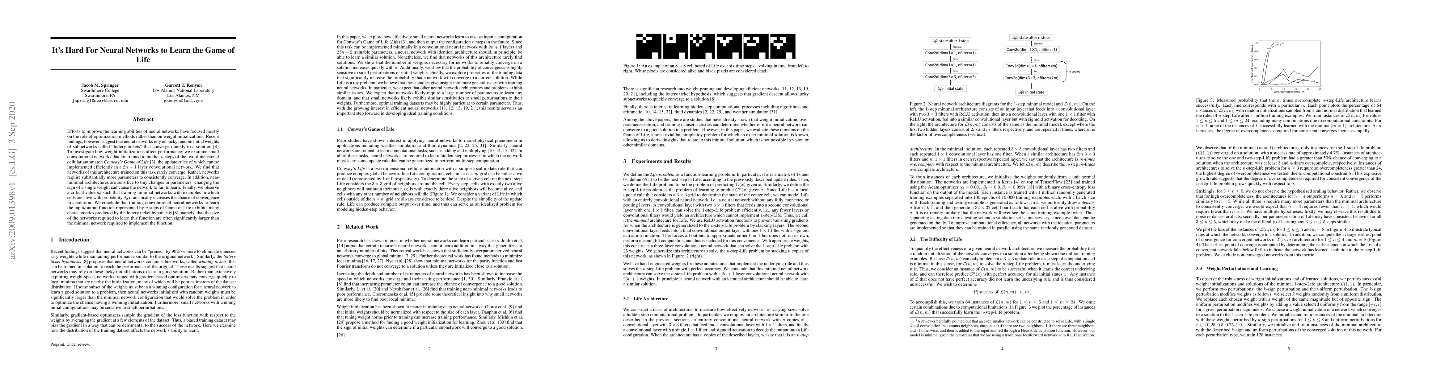 Efforts to improve the learning abilities of neural networks have focused mostly on the role of optimization methods rather than on weight initializations. Recent findings, however, suggest that neural networks rely on lucky random initial weights of subnetworks called "lottery tickets" that converge quickly to a solution. To investigate how weight initializations affect performance, we examine small convolutional networks that are trained to predict n steps of the two-dimensional cellular automaton Conway's Game of Life, the update rules of which can be implemented efficiently in a 2n+1 layer convolutional network. We find that networks of this architecture trained on this task rarely converge. Rather, networks require substantially more parameters to consistently converge. In addition, near-minimal architectures are sensitive to tiny changes in parameters: changing the sign of a single weight can cause the network to fail to learn. Finally, we observe a critical value d_0 such that training minimal networks with examples in which cells are alive with probability d_0 dramatically increases the chance of convergence to a solution. We conclude that training convolutional neural networks to learn the input/output function represented by n steps of Game of Life exhibits many characteristics predicted by the lottery ticket hypothesis, namely, that the size of the networks required to learn this function are often significantly larger than the minimal network required to implement the function.