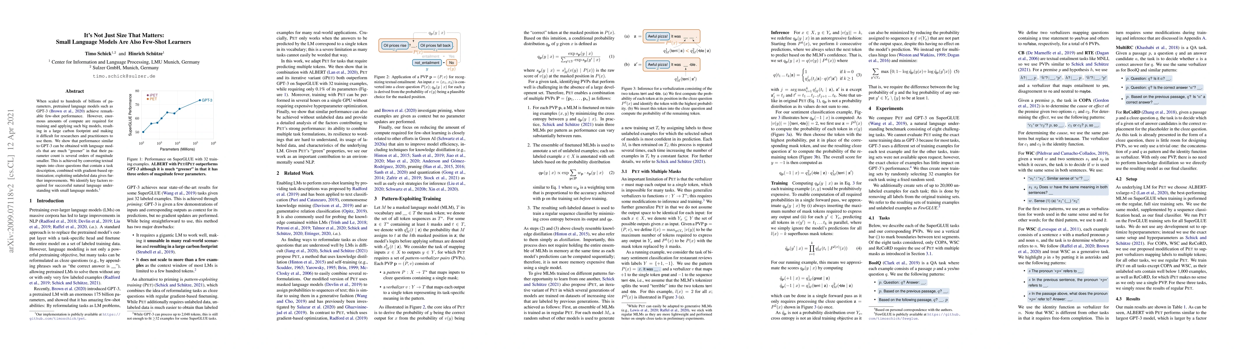 Small language models can achieve performance similar to large models like GPT-3 with significantly fewer parameters, using techniques such as converting inputs into cloze questions and exploiting unlabeled data.