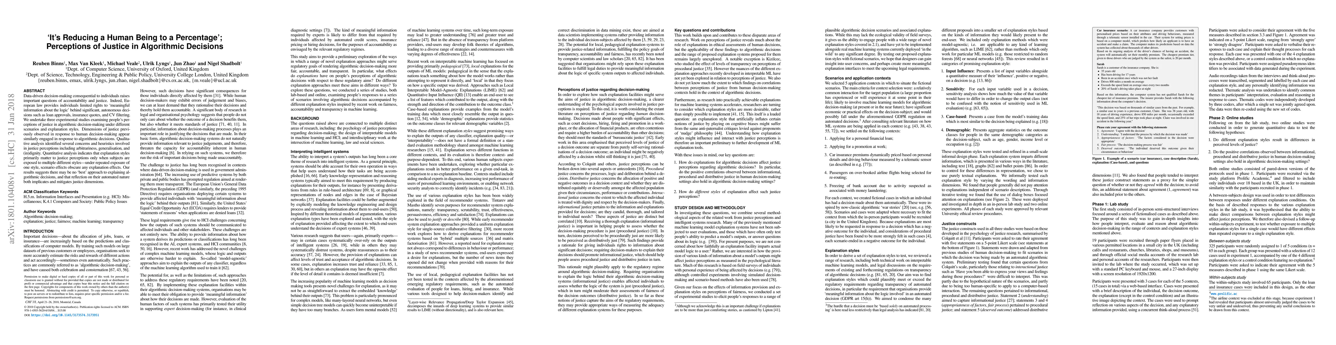 Data-driven decision-making consequential to individuals raises important questions of accountability and justice. Indeed, European law provides individuals limited rights to 'meaningful information about the logic' behind significant, autonomous decisions such as loan approvals, insurance quotes, and CV filtering. We undertake three experimental studies examining people's perceptions of justice in algorithmic decision-making under different scenarios and explanation styles. Dimensions of justice previously observed in response to human decision-making appear similarly engaged in response to algorithmic decisions. Qualitative analysis identified several concerns and heuristics involved in justice perceptions including arbitrariness, generalisation, and (in)dignity. Quantitative analysis indicates that explanation styles primarily matter to justice perceptions only when subjects are exposed to multiple different styles---under repeated exposure of one style, scenario effects obscure any explanation effects. Our results suggests there may be no 'best' approach to explaining algorithmic decisions, and that reflection on their automated nature both implicates and mitigates justice dimensions.