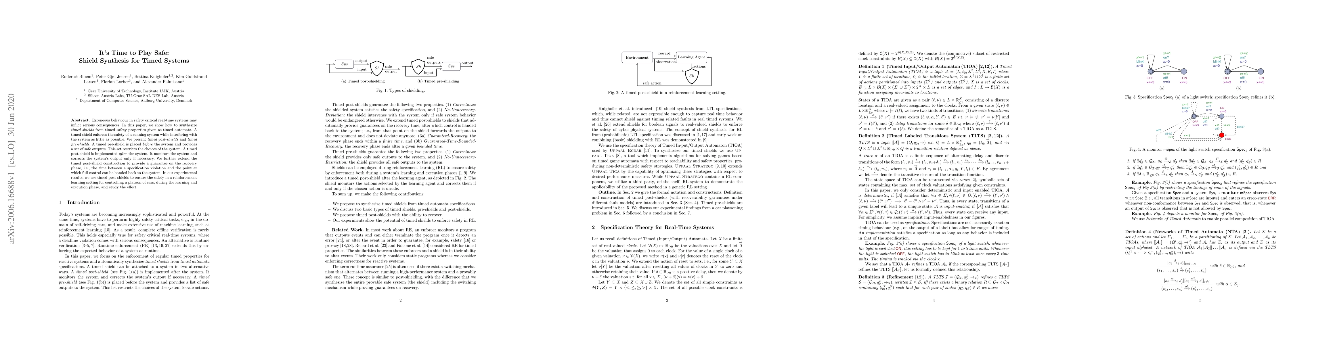This paper presents a method for synthesizing timed shields to enforce safety in real-time systems, using timed automata. It introduces timed pre-shields and post-shields to minimize interference while ensuring safety, and extends post-shields to guarantee recovery times, demonstrated in a reinforcement learning scenario for autonomous vehicle platoon control.