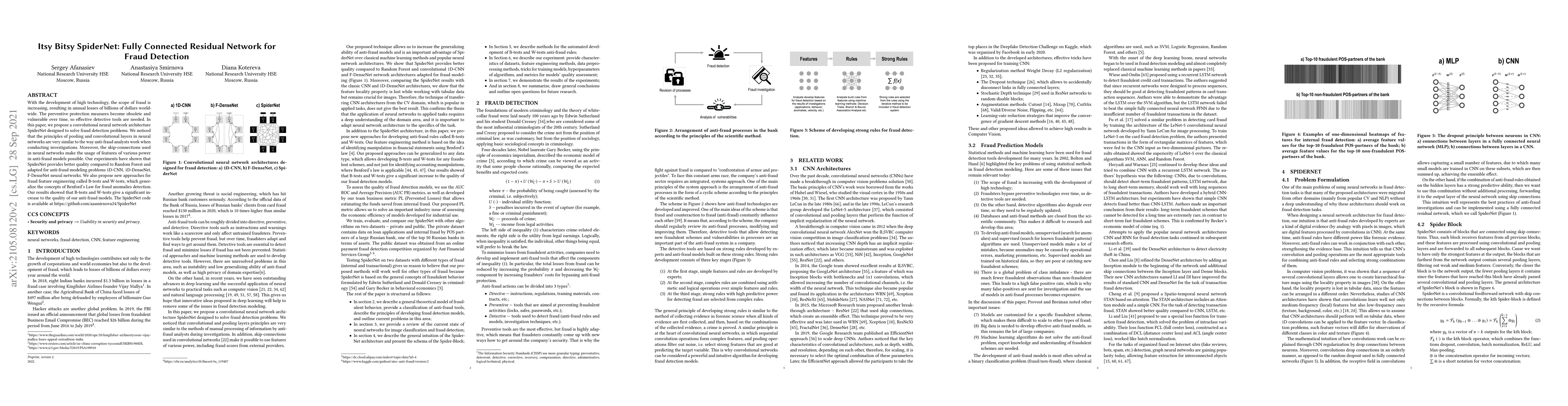 With the development of high technology, the scope of fraud is increasing, resulting in annual losses of billions of dollars worldwide. The preventive protection measures become obsolete and vulnerable over time, so effective detective tools are needed. In this paper, we propose a convolutional neural network architecture SpiderNet designed to solve fraud detection problems. We noticed that the principles of pooling and convolutional layers in neural networks are very similar to the way antifraud analysts work when conducting investigations. Moreover, the skip-connections used in neural networks make the usage of features of various power in antifraud models possible. Our experiments have shown that SpiderNet provides better quality compared to Random Forest and adapted for antifraud modeling problems 1D-CNN, 1D-DenseNet, F-DenseNet neural networks. We also propose new approaches for fraud feature engineering called B-tests and W-tests, which generalize the concepts of Benford's Law for fraud anomalies detection. Our results showed that B-tests and W-tests give a significant increase to the quality of our anti-fraud models. The SpiderNet code is available at https://github.com/aasmirnova24/SpiderNet