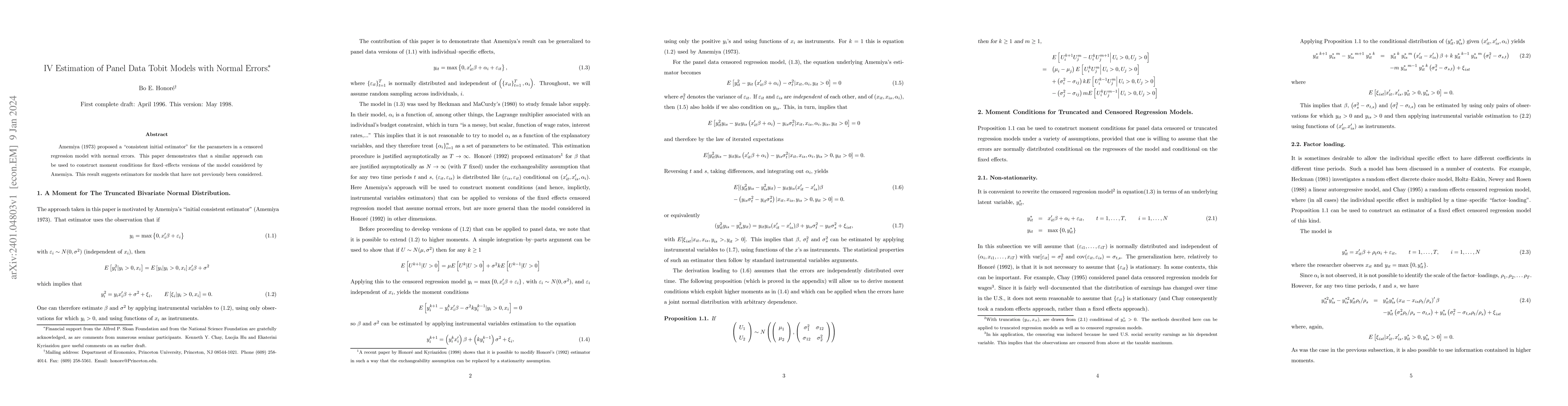 Amemiya (1973) proposed a ``consistent initial estimator'' for the parameters in a censored regression model with normal errors. This paper demonstrates that a similar approach can be used to construct moment conditions for fixed--effects versions of the model considered by Amemiya. This result suggests estimators for models that have not previously been considered.