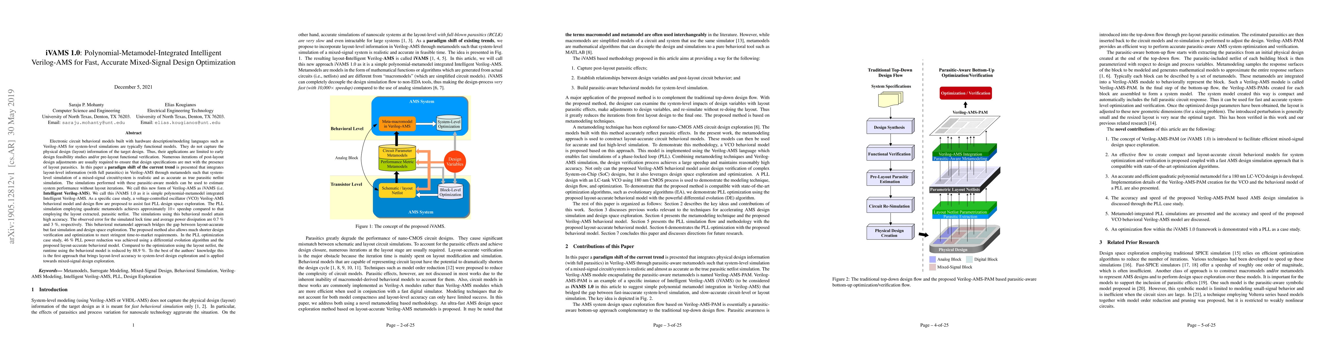 iVAMS 1.0 integrates polynomial-metamodel-based layout information into Verilog-AMS for fast, accurate mixed-signal design optimization, achieving up to 10X speedup and 88.9% runtime reduction compared to traditional layout netlist simulations, while maintaining high accuracy.