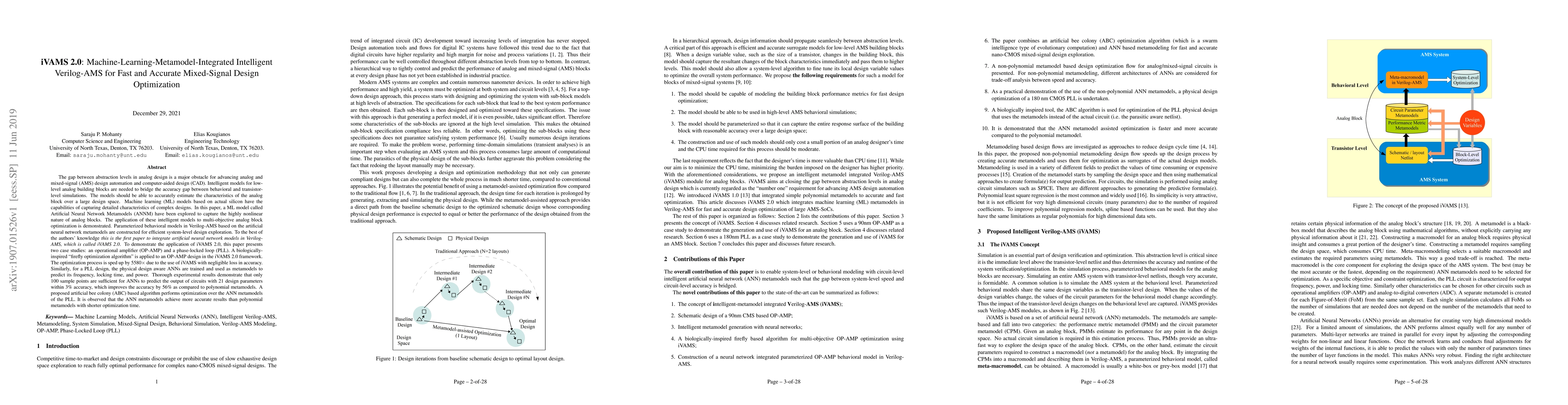 The gap between abstraction levels in analog design is a major obstacle for advancing analog and mixed-signal (AMS) design automation and computer-aided design (CAD). Intelligent models for low-level analog building blocks are needed to bridge the accuracy gap between behavioral and transistor-level simulations. The models should be able to accurately estimate the characteristics of the analog block over a large design space. Machine learning (ML) models based on actual silicon have the capabilities of capturing detailed characteristics of complex designs. In this paper, a ML model called Artificial Neural Network Metamodels (ANNM) have been explored to capture the highly nonlinear nature of analog blocks. The application of these intelligent models to multi-objective AMS block optimization is demonstrated. Parameterized behavioral models in Verilog-AMS based on the ANN metamodels are constructed for efficient AMS design exploration. To the best of the authors' knowledge this is the first paper to integrate ANN models in Verilog-AMS, which is called iVAMS 2.0. To demonstrate the application of iVAMS 2.0, this paper presents two case studies: an operational amplifier (OP-AMP) and a phase-locked loop (PLL). A biologically-inspired "firefly optimization algorithm" is applied to an OP-AMP design in the iVAMS 2.0 framework. The optimization process is sped up by 5580X due to the use of iVAMS with negligible loss in accuracy. Similarly, for a PLL design, the physical design aware ANNs are trained and used as metamodels to predict its frequency, locking time, and power. Thorough experimental results demonstrate that only 100 sample points are sufficient for ANNs to predict the output of circuits with 21 design parameters within 3% accuracy. A proposed artificial bee colony (ABC) based algorithm performs optimization over the ANN metamodels of the PLL.