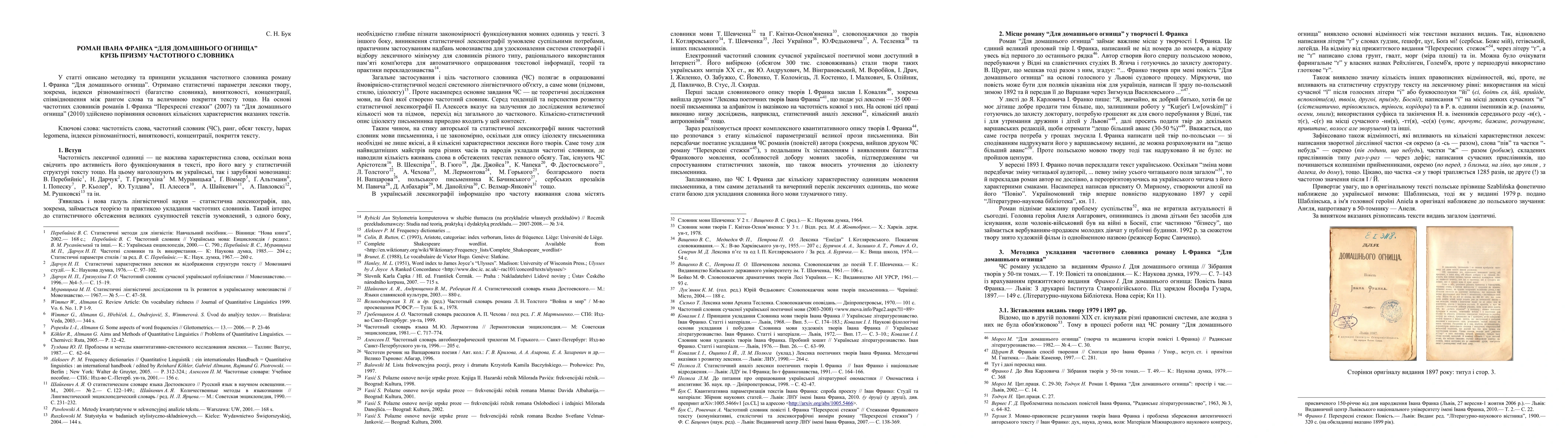 This paper details the methodology for compiling a frequency dictionary for Ivan Franko's novel "For the Hearth," analyzing statistical parameters like vocabulary variety and concentration. It also compares the quantitative characteristics of this novel with Franko's "The Cross-Paths" based on their respective frequency dictionaries.