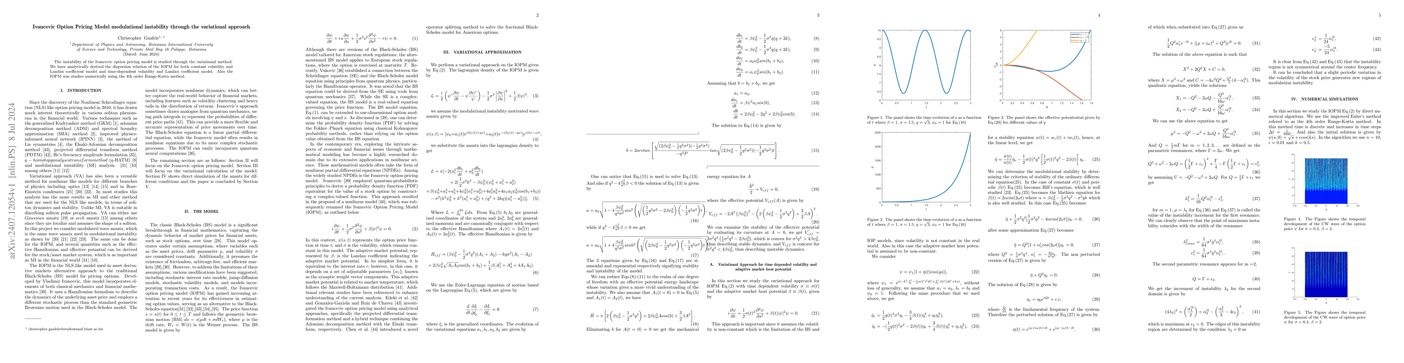 This research investigates the modulational instability in the Ivancevic Option Pricing Model (IOPM) via variational methods, deriving the dispersion relation for both constant and time-dependent volatility scenarios. Numerical simulations using the 4th order Runge-Kutta method complement the analytical findings.