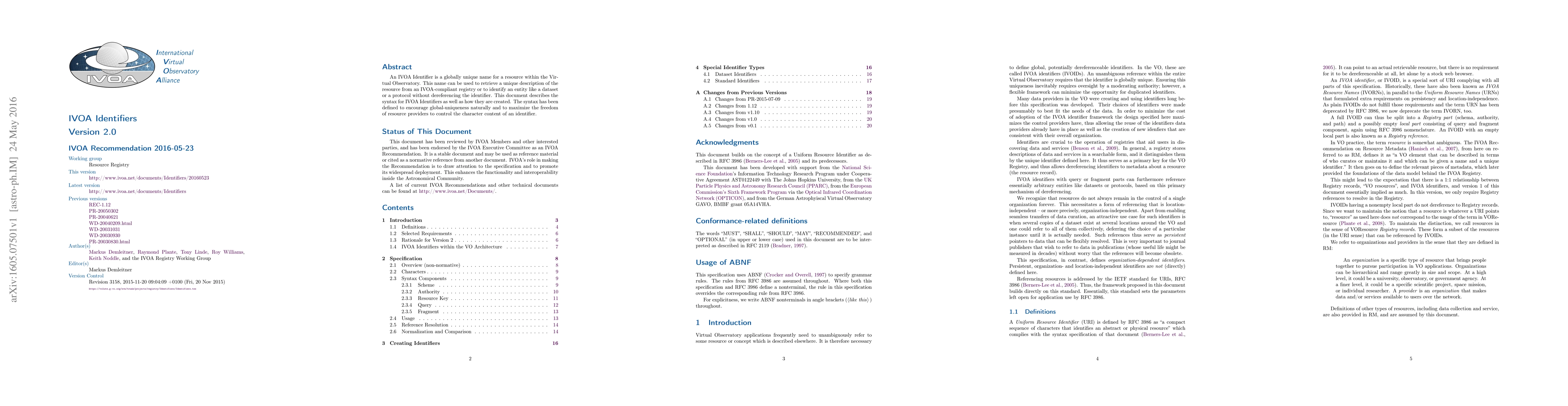 An IVOA Identifier is a globally unique name for a resource within the Virtual Observatory. This name can be used to retrieve a unique description of the resource from an IVOA-compliant registry or to identify an entity like a dataset or a protocol without dereferencing the identifier. This document describes the syntax for IVOA Identifiers as well as how they are created. The syntax has been defined to encourage global-uniqueness naturally and to maximize the freedom of resource providers to control the character content of an identifier.