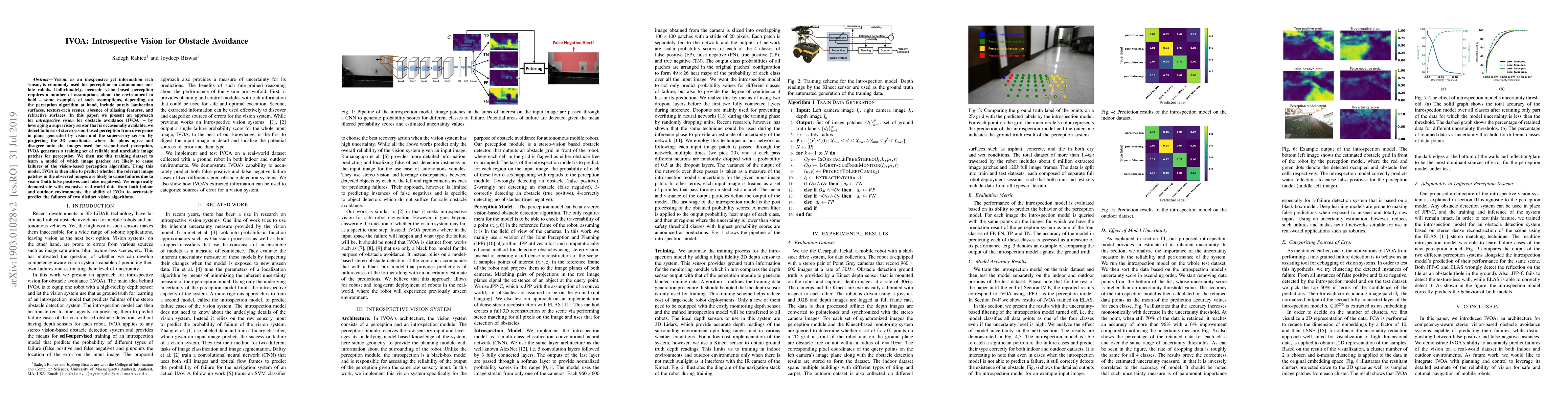 This paper introduces IVOA, an introspective vision method for obstacle avoidance using a supervisory sensor to detect failures in stereo vision-based perception. It trains a model to predict unreliable image patches that cause vision failures, validated through real-world data in both indoor and outdoor settings.