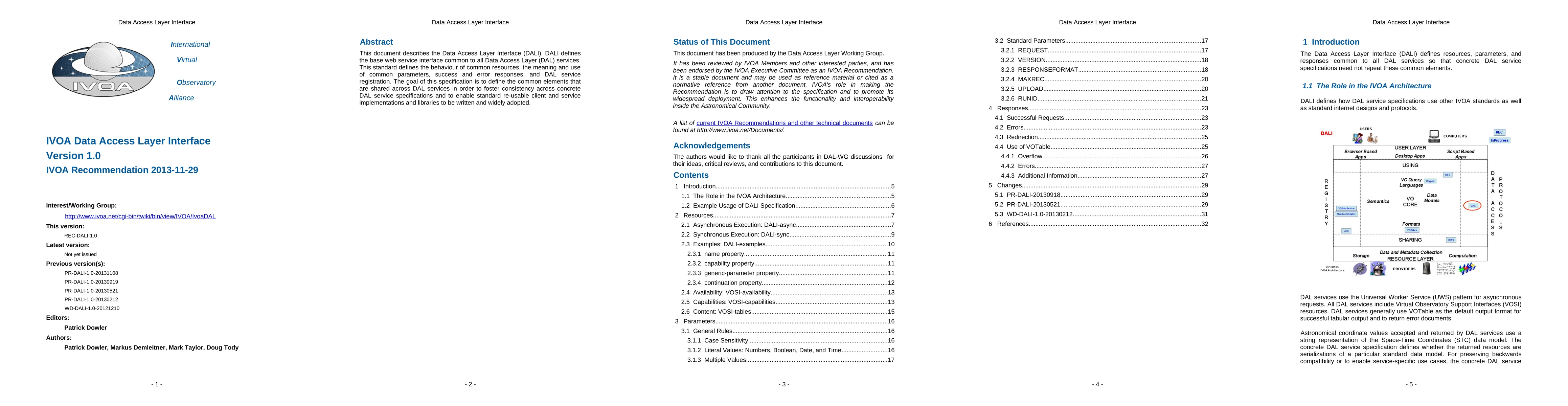The IVOA Recommendation: DALI (Data Access Layer Interface Version 1.0) standardizes the base web service interface for Data Access Layer services, promoting consistency and enabling reusable client and service implementations across various DAL services.