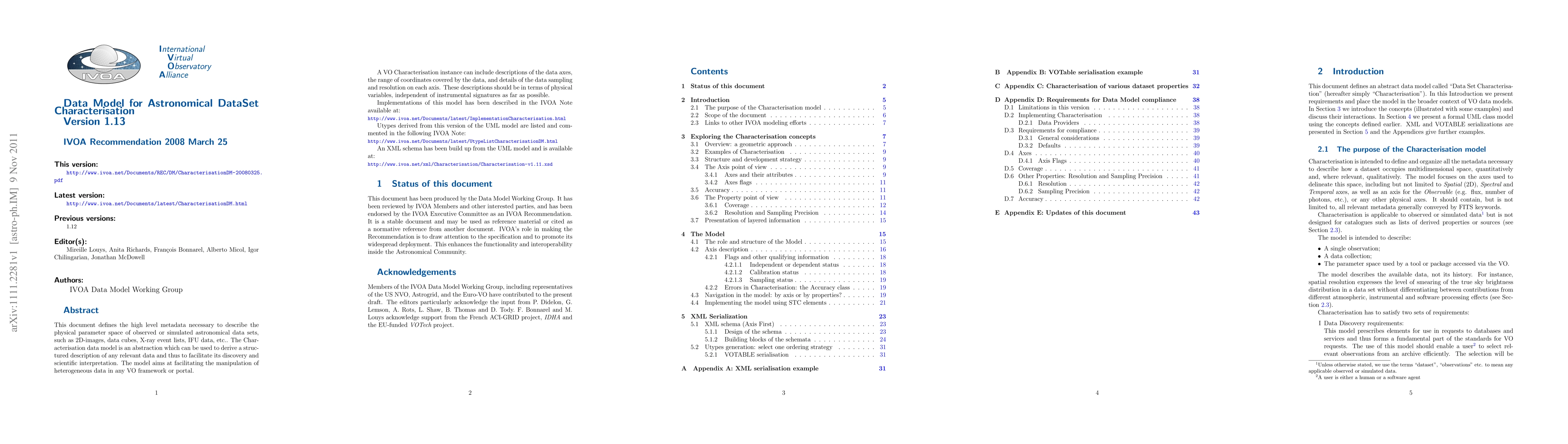 This document defines the high level metadata necessary to describe the physical parameter space of observed or simulated astronomical data sets, such as 2D-images, data cubes, X-ray event lists, IFU data, etc.. The Characterisation data model is an abstraction which can be used to derive a structured description of any relevant data and thus to facilitate its discovery and scientific interpretation. The model aims at facilitating the manipulation of heterogeneous data in any VO framework or portal. A VO Characterisation instance can include descriptions of the data axes, the range of coordinates covered by the data, and details of the data sampling and resolution on each axis. These descriptions should be in terms of physical variables, independent of instrumental signatures as far as possible. Implementations of this model has been described in the IVOA Note available at: http://www.ivoa.net/Documents/latest/ImplementationCharacterisation.html Utypes derived from this version of the UML model are listed and commented in the following IVOA Note: http://www.ivoa.net/Documents/latest/UtypeListCharacterisationDM.html An XML schema has been build up from the UML model and is available at: http://www.ivoa.net/xml/Characterisation/Characterisation-v1.11.xsd