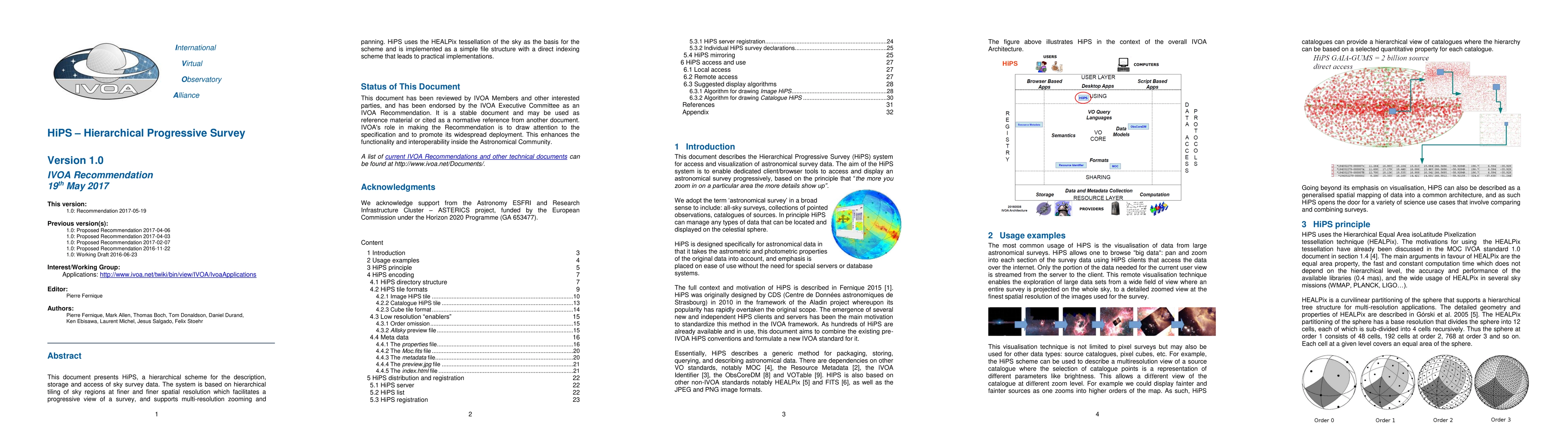 This document presents HiPS, a hierarchical scheme for the description, storage and access of sky survey data. The system is based on hierarchical tiling of sky regions at finer and finer spatial resolution which facilitates a progressive view of a survey, and supports multi-resolution zooming and panning. HiPS uses the HEALPix tessellation of the sky as the basis for the scheme and is implemented as a simple file structure with a direct indexing scheme that leads to practical implementations.