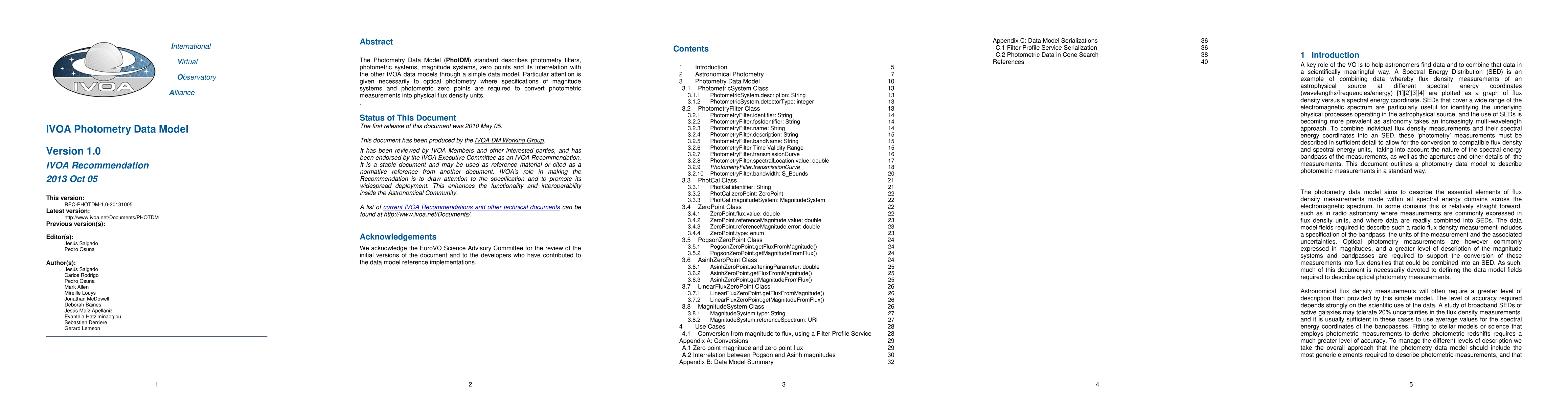 The IVOA Photometry Data Model (PhotDM) standard outlines the structure for describing photometry filters, systems, magnitudes, and zero points, emphasizing the conversion of optical photometry measurements into physical flux density units. It integrates seamlessly with other IVOA data models to ensure consistent data representation.