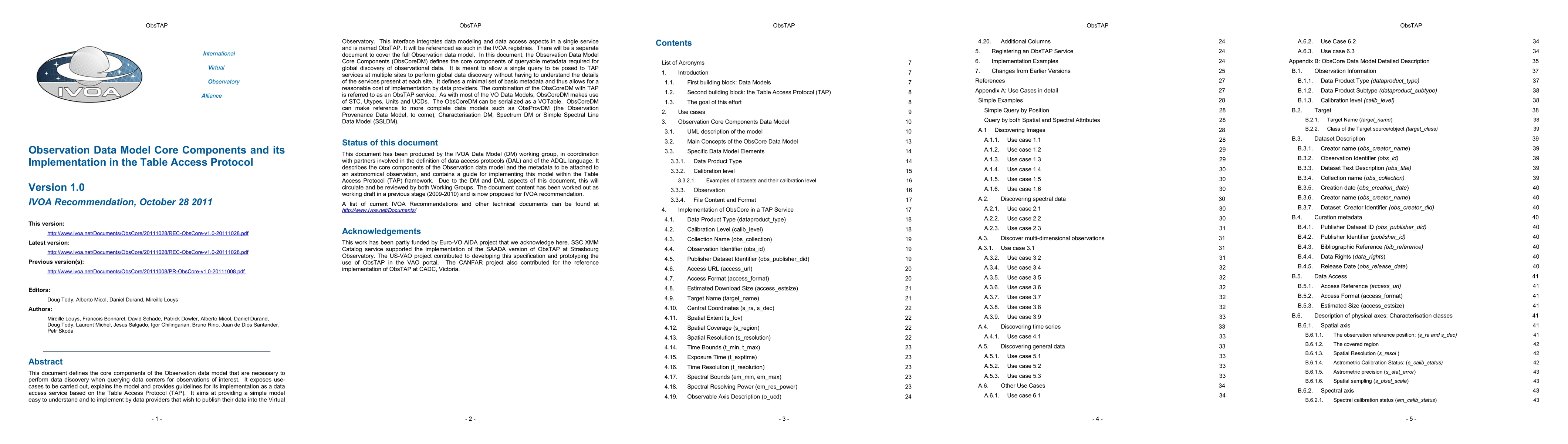 This document defines the core components of the Observation data model that are necessary to perform data discovery when querying data centers for observations of interest. It exposes use-cases to be carried out, explains the model and provides guidelines for its implementation as a data access service based on the Table Access Protocol (TAP). It aims at providing a simple model easy to understand and to implement by data providers that wish to publish their data into the Virtual Observatory. This interface integrates data modeling and data access aspects in a single service and is named ObsTAP. It will be referenced as such in the IVOA registries. There will be a separate document to cover the full Observation data model. In this document, the Observation Data Model Core Components (ObsCoreDM) defines the core components of queryable metadata required for global discovery of observational data. It is meant to allow a single query to be posed to TAP services at multiple sites to perform global data discovery without having to understand the details of the services present at each site. It defines a minimal set of basic metadata and thus allows for a reasonable cost of implementation by data providers. The combination of the ObsCoreDM with TAP is referred to as an ObsTAP service. As with most of the VO Data Models, ObsCoreDM makes use of STC, Utypes, Units and UCDs. The ObsCoreDM can be serialized as a VOTable. ObsCoreDM can make reference to more complete data models such as ObsProvDM (the Observation Provenance Data Model, to come), Characterisation DM, Spectrum DM or Simple Spectral Line Data Model (SSLDM).
