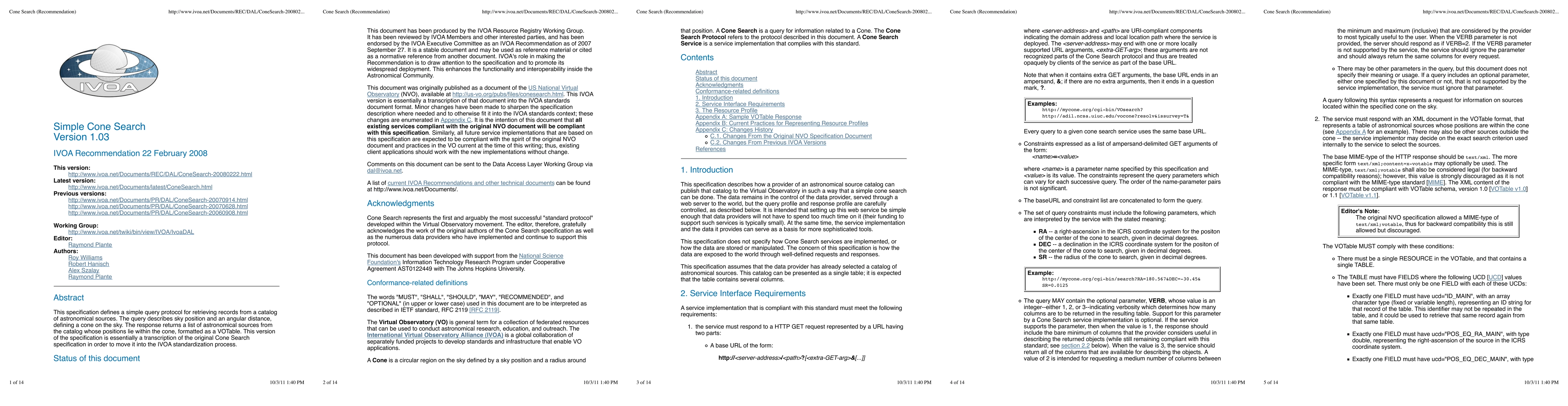 This specification defines a simple query protocol for retrieving records from a catalog of astronomical sources. The query describes sky position and an angular distance, defining a cone on the sky. The response returns a list of astronomical sources from the catalog whose positions lie within the cone, formatted as a VOTable. This version of the specification is essentially a transcription of the original Cone Search specification in order to move it into the IVOA standardization process.