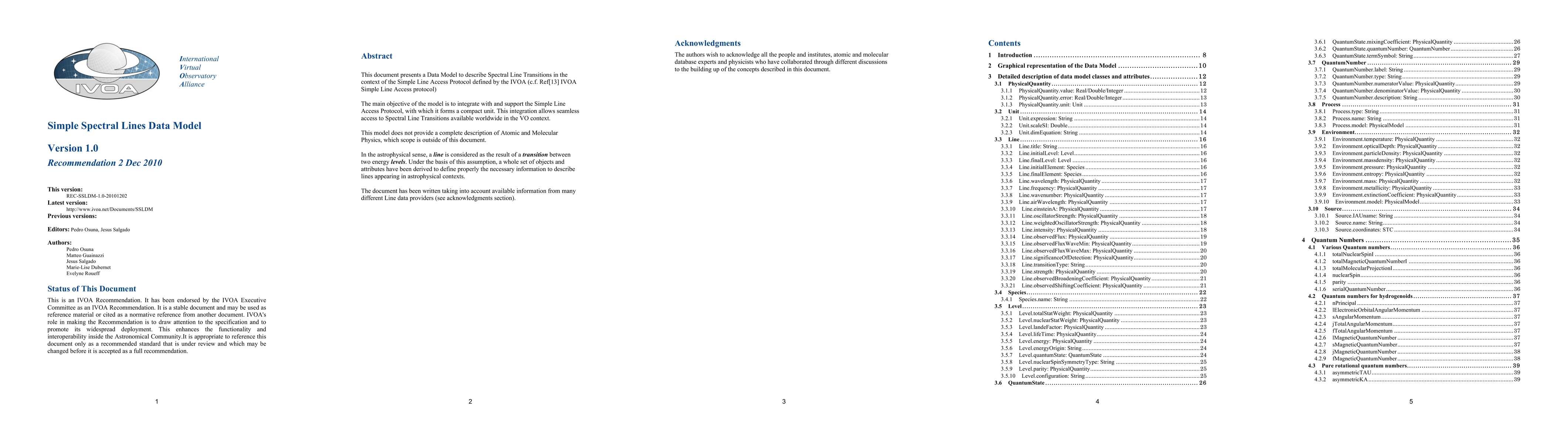 This document presents a Data Model to describe Spectral Line Transitions in the context of the Simple Line Access Protocol defined by the IVOA (c.f. Ref[13] IVOA Simple Line Access protocol) The main objective of the model is to integrate with and support the Simple Line Access Protocol, with which it forms a compact unit. This integration allows seamless access to Spectral Line Transitions available worldwide in the VO context. This model does not provide a complete description of Atomic and Molecular Physics, which scope is outside of this document. In the astrophysical sense, a line is considered as the result of a transition between two energy levels. Under the basis of this assumption, a whole set of objects and attributes have been derived to define properly the necessary information to describe lines appearing in astrophysical contexts. The document has been written taking into account available information from many different Line data providers (see acknowledgments section).