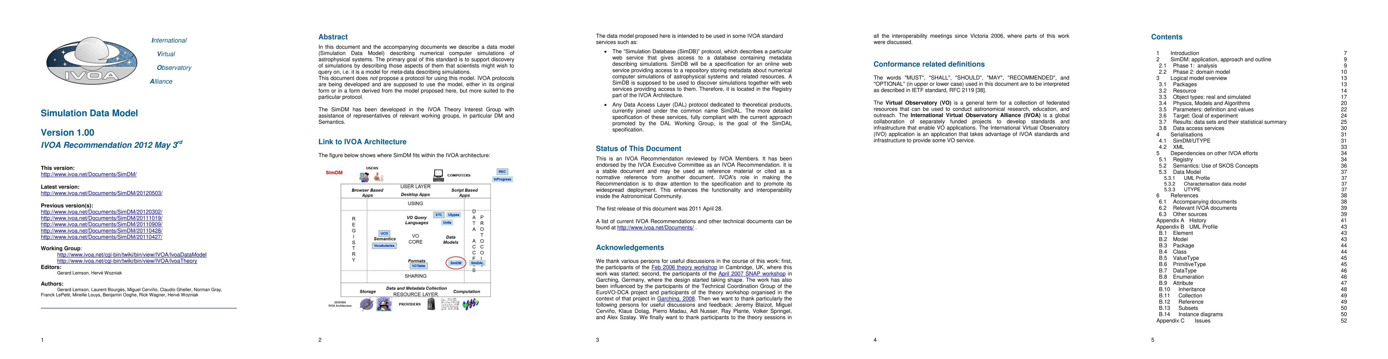 In this document and the accompanying documents we describe a data model (Simulation Data Model) describing numerical computer simulations of astrophysical systems. The primary goal of this standard is to support discovery of simulations by describing those aspects of them that scientists might wish to query on, i.e. it is a model for meta-data describing simulations. This document does not propose a protocol for using this model. IVOA protocols are being developed and are supposed to use the model, either in its original form or in a form derived from the model proposed here, but more suited to the particular protocol. The SimDM has been developed in the IVOA Theory Interest Group with assistance of representatives of relevant working groups, in particular DM and Semantics.
