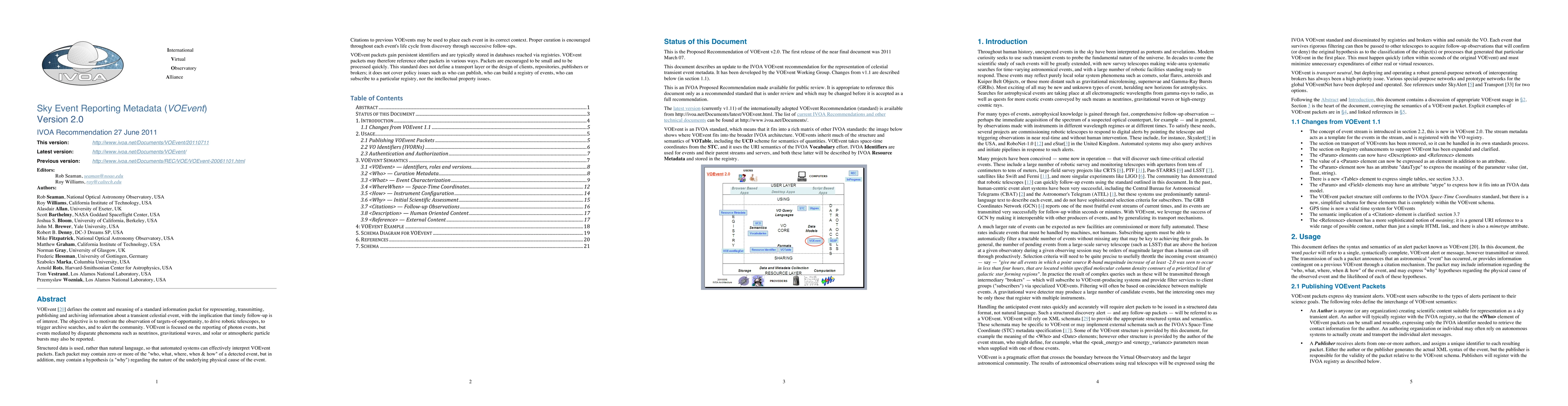 The IVOA Recommendation on Sky Event Reporting Metadata Version 2.0 standardizes VOEvent packets for reporting transient celestial events, emphasizing automated interpretation and timely follow-up. These packets include structured data to describe detected events and their underlying physical causes, encouraging proper curation and referencing of previous events.