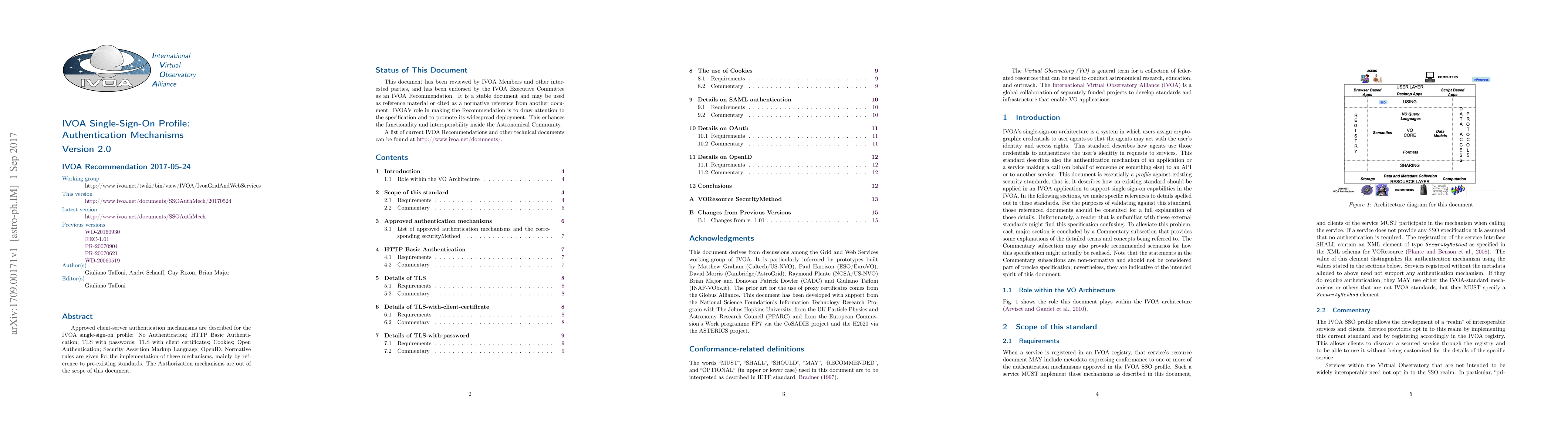 The IVOA SSO Profile Authentication Mechanisms Version 2.0 provides standardized authentication methods for single-sign-on profiles, including HTTP Basic Auth, TLS with passwords, and OpenID.