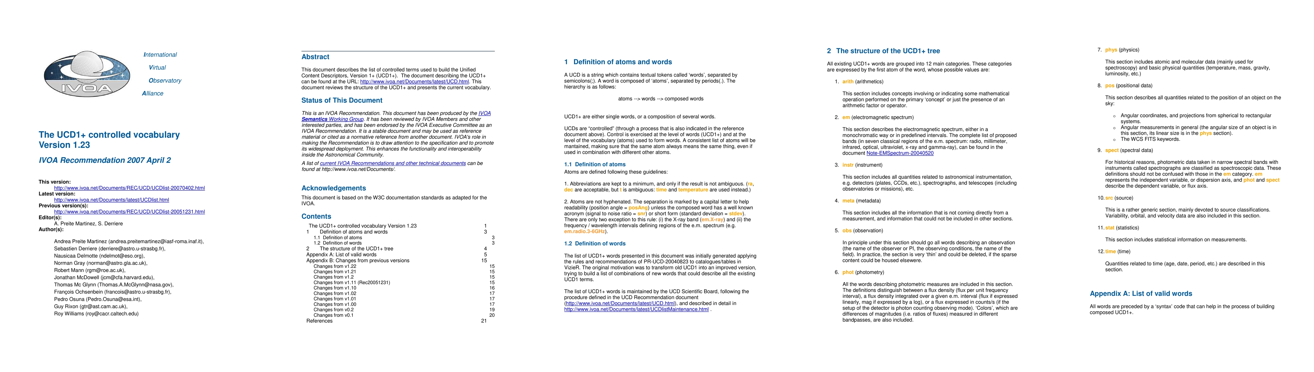This document describes the list of controlled terms used to build the Unified Content Descriptors, Version 1+ (UCD1+). The document describing the UCD1+ can be found at the URL: http://www.ivoa.net/Documents/latest/UCD.html. This document reviews the structure of the UCD1+ and presents the current vocabulary.