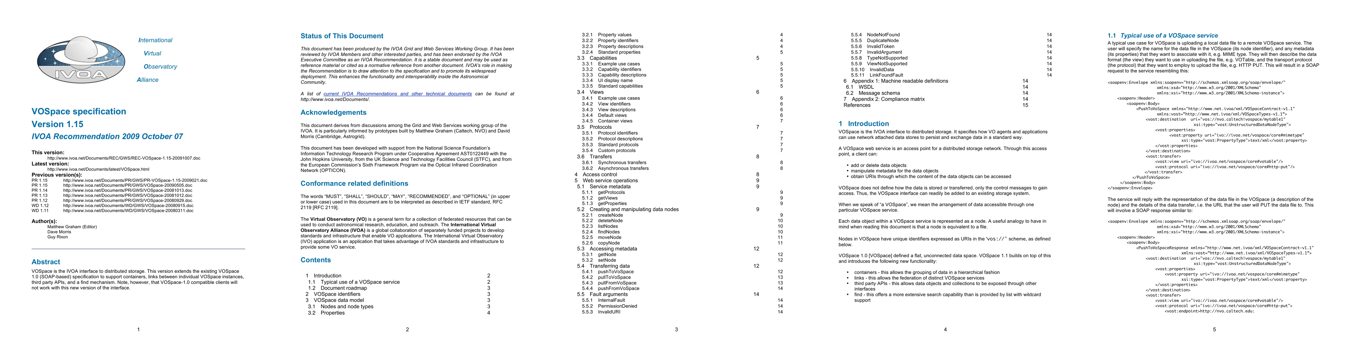 The IVOA Recommendation for VOSpace specification Version 1.15 extends the SOAP-based VOSpace 1.0 interface to support containers, links, third-party APIs, and a find mechanism, though it is not backward compatible with VOSpace 1.0 clients.