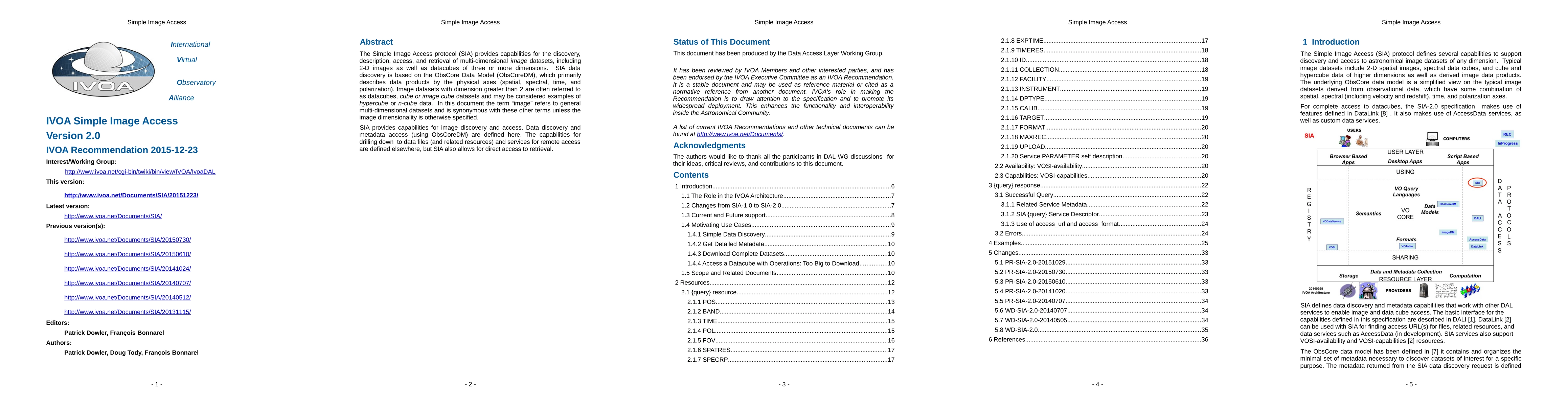 The Simple Image Access protocol (SIA) provides capabilities for the discovery, description, access, and retrieval of multi-dimensional image datasets, including 2-D images as well as datacubes of three or more dimensions. SIA data discovery is based on the ObsCore Data Model (ObsCoreDM), which primarily describes data products by the physical axes (spatial, spectral, time, and polarization). Image datasets with dimension greater than 2 are often referred to as datacubes, cube or image cube datasets and may be considered examples of hypercube or n-cube data. In this document the term "image" refers to general multi-dimensional datasets and is synonymous with these other terms unless the image dimensionality is otherwise specified. SIA provides capabilities for image discovery and access. Data discovery and metadata access (using ObsCoreDM) are defined here. The capabilities for drilling down to data files (and related resources) and services for remote access are defined elsewhere, but SIA also allows for direct access to retrieval.