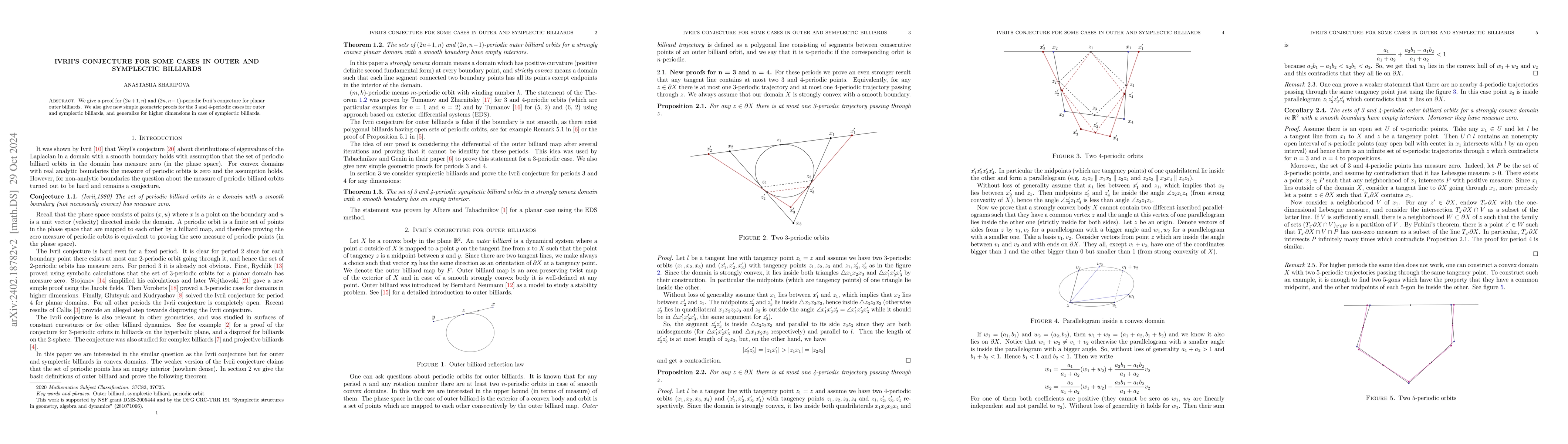 Summary: This paper proves Ivrii's conjecture for $(2n + 1,n)$ and $(2n, n-1)$-periodic planar outer billiards, provides new geometric proofs for 3 and 4-periodic cases in both outer and symplectic billiards, and extends results to higher dimensions for symplectic billiards.