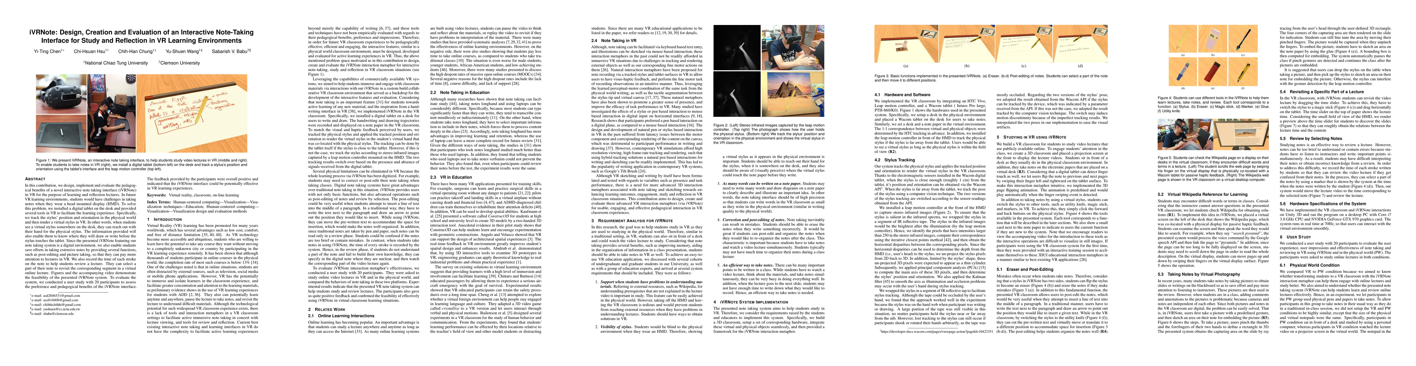 Researchers designed an interactive note-taking interface called iVRNote to aid students in taking notes while wearing a VR headset, improving learning and reflection in VR lectures. A user study with 20 participants showed the system offered pedagogical benefits and user preference.