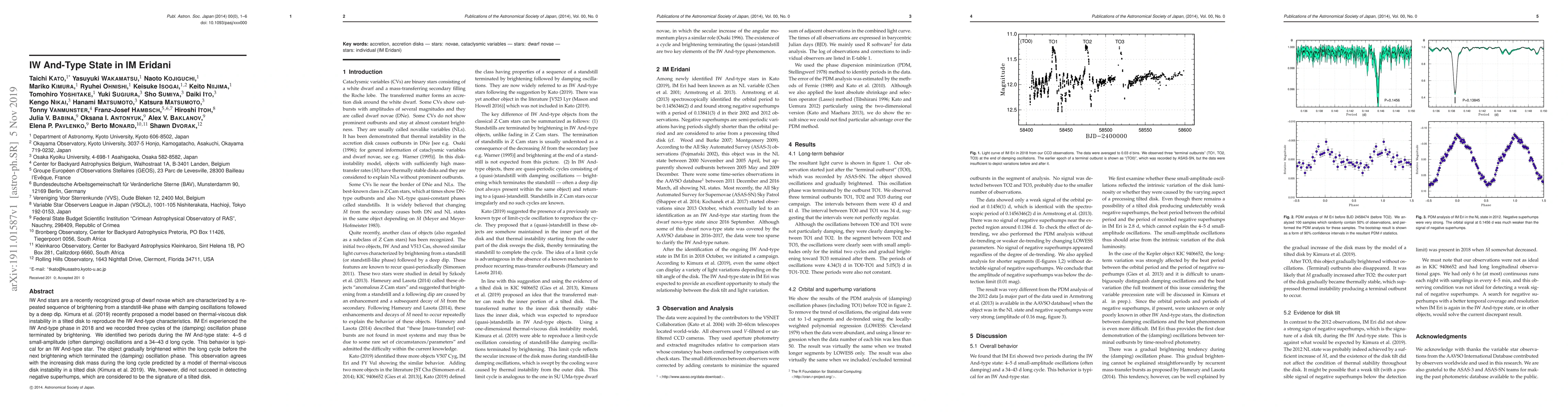 IM Eridani exhibited an IW And-type state characterized by repeated brightening cycles with damping oscillations, supporting the thermal-viscous disk instability model. Despite observing the expected long cycle and small-amplitude oscillations, negative superhumps indicative of a tilted disk were not detected.