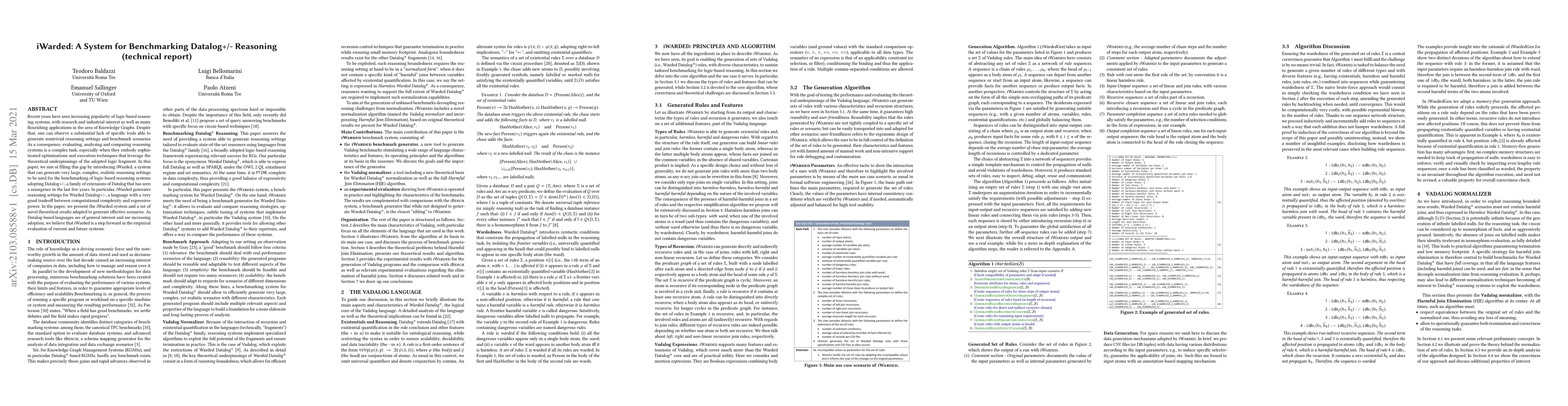 iWarded is a system designed to generate large, complex reasoning settings for benchmarking logic-based reasoning systems using Datalog+/-, highlighting its utility in evaluating Warded Datalog+/-. It aims to fill the gap in existing tools for creating benchmark scenarios for sophisticated reasoning systems.