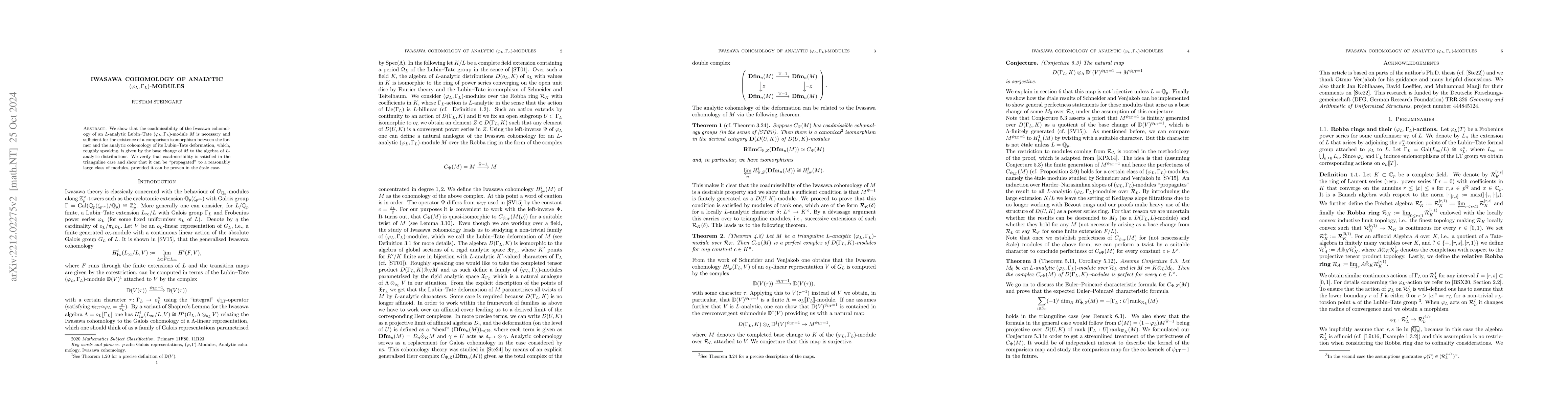 We show that the coadmissibility of the Iwasawa cohomology of an $L$-analytic Lubin-Tate $(\varphi_L,\Gamma_L)$-module $M$ is necessary and sufficient for the existence of a comparison isomorphism between the former and the analytic cohomology of its Lubin-Tate deformation, which, roughly speaking, is given by the base change of $M$ to the algebra of $L$-analytic distributions. We verify that coadmissibility is satisfied in the trianguline case and show that it can be ``propagated'' to a reasonably large class of modules, provided it can be proven in the \'etale case.