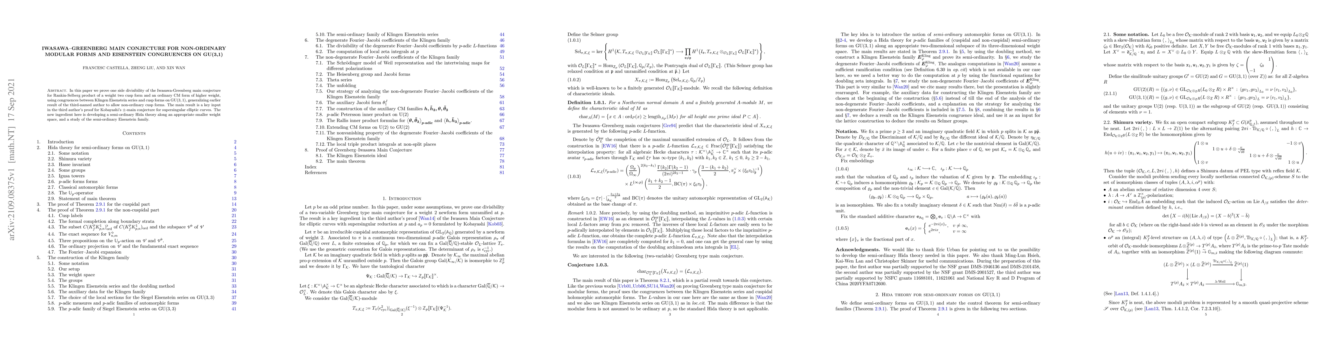 This paper proves divisibility in the Iwasawa-Greenberg main conjecture for Rankin-Selberg products involving a weight two cusp form and an ordinary CM form, using Eisenstein congruences on $\mathrm{GU}(3,1)$. The work generalizes previous results to non-ordinary forms and provides crucial input for proving Kobayashi's $\pm$-main conjecture for supersingular elliptic curves.