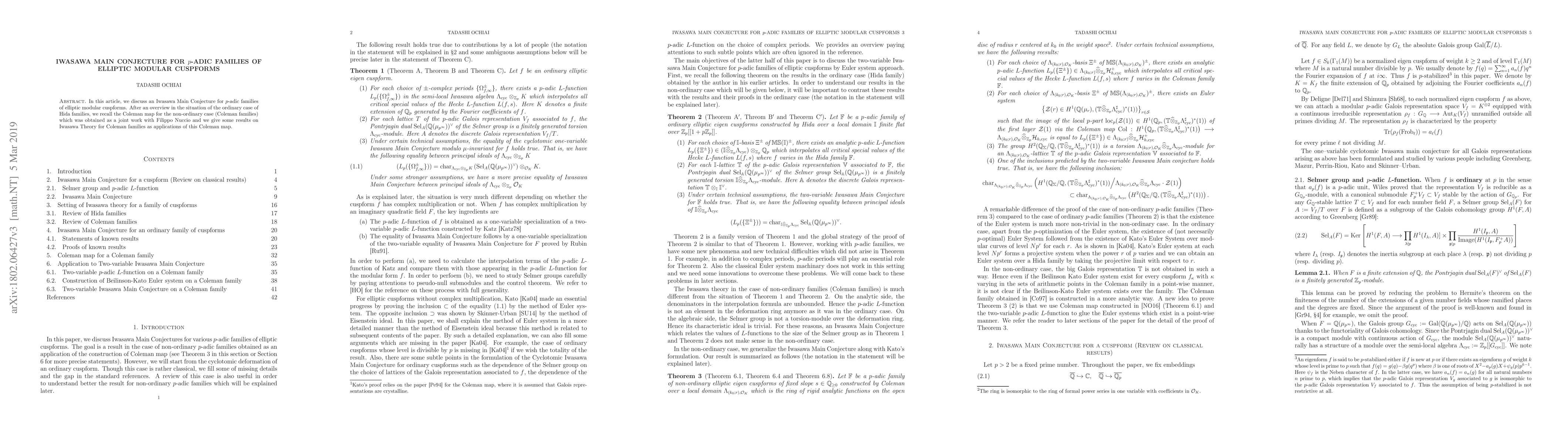 This paper discusses the Iwasawa Main Conjecture for $p$-adic families of elliptic modular cuspforms, introducing a Coleman map for non-ordinary cases and constructing a two-variable $p$-adic $L$-function and Beilinson-Kato Euler systems. It proves half of the Iwasawa Main Conjecture for Coleman families.