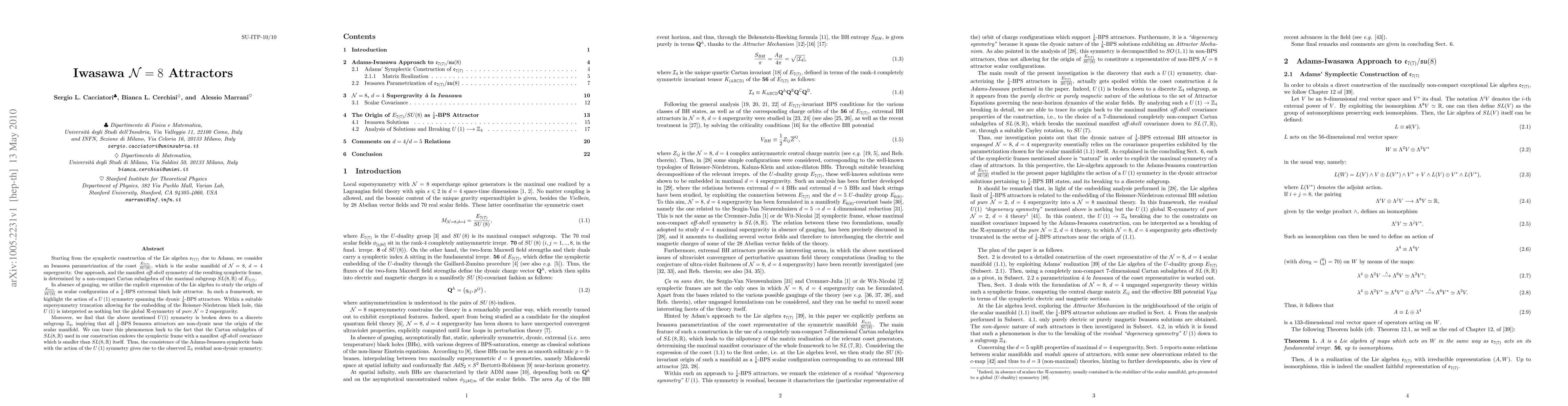 Starting from the symplectic construction of the Lie algebra e_7(7) due to Adams, we consider an Iwasawa parametrization of the coset E_7(7)/SU(8), which is the scalar manifold of N=8, d=4 supergravity. Our approach, and the manifest off-shell symmetry of the resulting symplectic frame, is determined by a non-compact Cartan subalgebra of the maximal subgroup SL(8,R) of E_7(7). In absence of gauging, we utilize the explicit expression of the Lie algebra to study the origin of E_7(7)/SU(8) as scalar configuration of a 1/8-BPS extremal black hole attractor. In such a framework, we highlight the action of a U(1) symmetry spanning the dyonic 1/8-BPS attractors. Within a suitable supersymmetry truncation allowing for the embedding of the Reissner-Nordstrom black hole, this U(1) is interpreted as nothing but the global R-symmetry of pure N=2 supergravity. Moreover, we find that the above mentioned U(1) symmetry is broken down to a discrete subgroup Z_4, implying that all 1/8-BPS Iwasawa attractors are non-dyonic near the origin of the scalar manifold. We can trace this phenomenon back to the fact that the Cartan subalgebra of SL(8,R) used in our construction endows the symplectic frame with a manifest off-shell covariance which is smaller than SL(8,R) itself. Thus, the consistence of the Adams-Iwasawa symplectic basis with the action of the U(1) symmetry gives rise to the observed Z_4 residual non-dyonic symmetry.