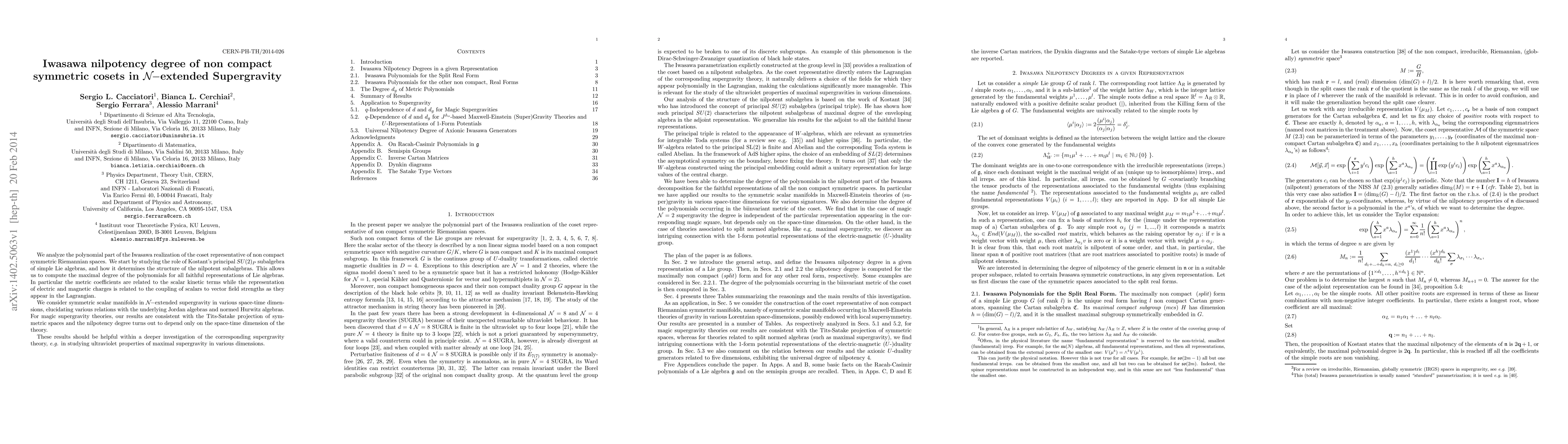 We analyze the polynomial part of the Iwasawa realization of the coset representative of non compact symmetric Riemannian spaces. We start by studying the role of Kostant's principal SU(2)_P subalgebra of simple Lie algebras, and how it determines the structure of the nilpotent subalgebras. This allows us to compute the maximal degree of the polynomials for all faithful representations of Lie algebras. In particular the metric coefficients are related to the scalar kinetic terms while the representation of electric and magnetic charges is related to the coupling of scalars to vector field strengths as they appear in the Lagrangian. We consider symmetric scalar manifolds in N-extended supergravity in various space-time dimensions, elucidating various relations with the underlying Jordan algebras and normed Hurwitz algebras. For magic supergravity theories, our results are consistent with the Tits-Satake projection of symmetric spaces and the nilpotency degree turns out to depend only on the space-time dimension of the theory. These results should be helpful within a deeper investigation of the corresponding supergravity theory, e.g. in studying ultraviolet properties of maximal supergravity in various dimensions.
