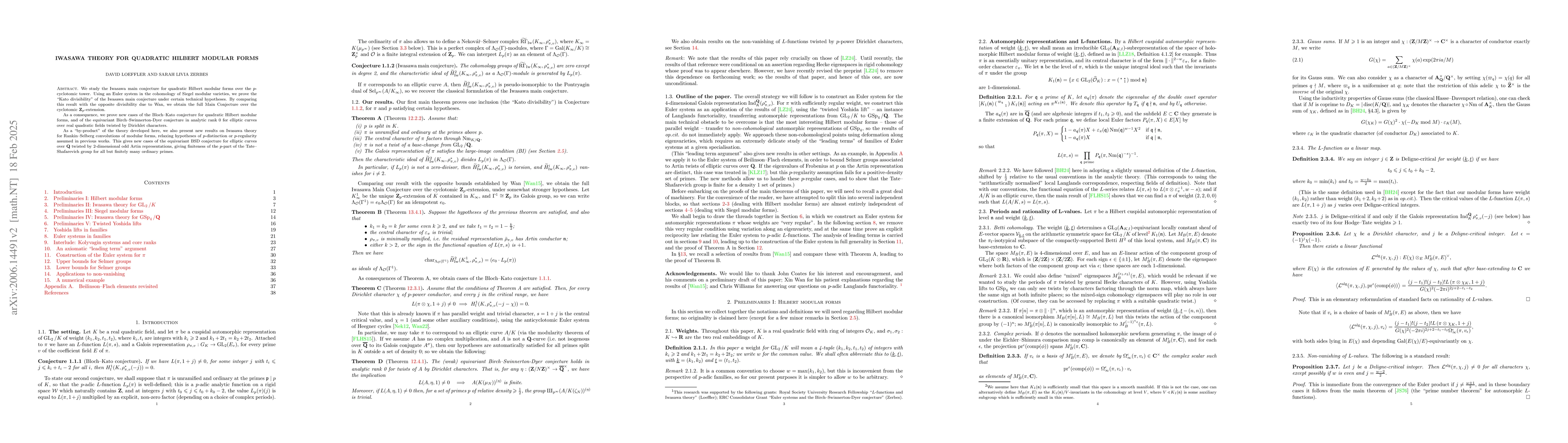 This paper proves the Iwasawa main conjecture for quadratic Hilbert modular forms over the p-cyclotomic tower using an Euler system and establishes the full Main Conjecture over the cyclotomic Zp-extension, leading to new cases of the Bloch-Kato and equivariant Birch-Swinnerton-Dyer conjectures.