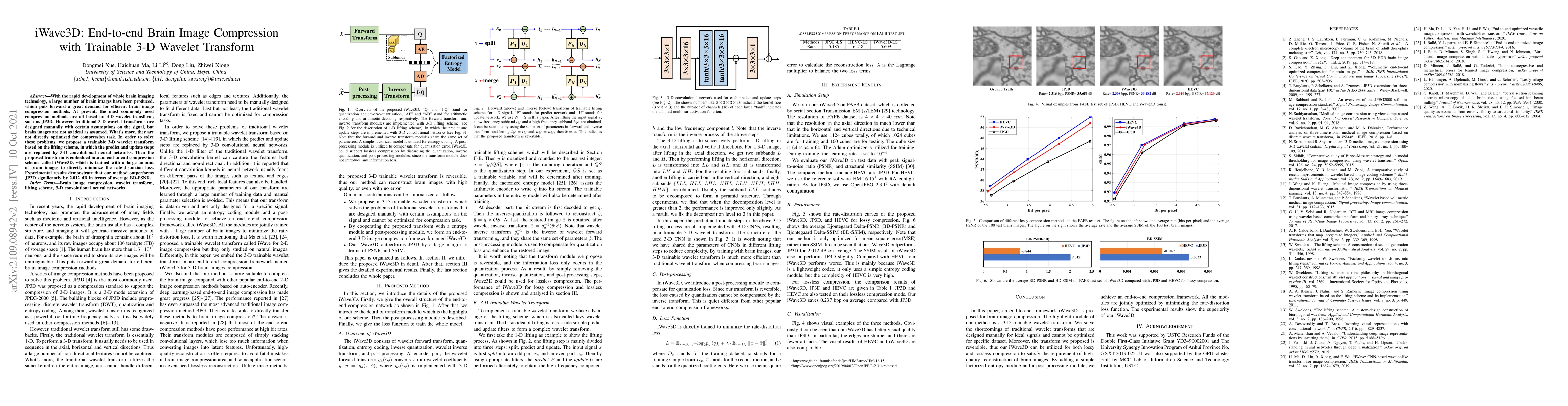 The paper proposes iWave3D, an end-to-end brain image compression method utilizing a trainable 3-D wavelet transform with 3-D convolutional neural networks, outperforming traditional methods like JP3D by 2.012 dB in average BD-PSNR.
