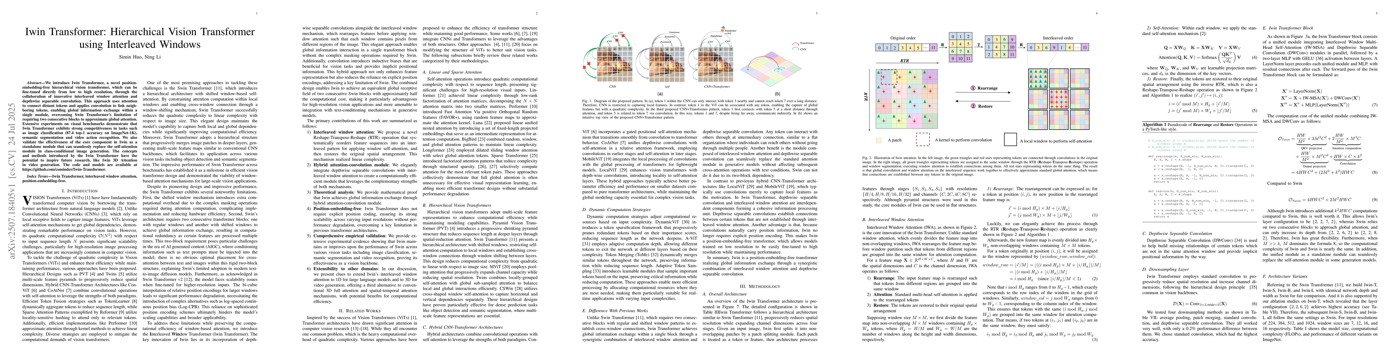 We introduce Iwin Transformer, a novel position-embedding-free hierarchical vision transformer, which can be fine-tuned directly from low to high resolution, through the collaboration of innovative interleaved window attention and depthwise separable convolution. This approach uses attention to connect distant tokens and applies convolution to link neighboring tokens, enabling global information exchange within a single module, overcoming Swin Transformer's limitation of requiring two consecutive blocks to approximate global attention. Extensive experiments on visual benchmarks demonstrate that Iwin Transformer exhibits strong competitiveness in tasks such as image classification (87.4 top-1 accuracy on ImageNet-1K), semantic segmentation and video action recognition. We also validate the effectiveness of the core component in Iwin as a standalone module that can seamlessly replace the self-attention module in class-conditional image generation. The concepts and methods introduced by the Iwin Transformer have the potential to inspire future research, like Iwin 3D Attention in video generation. The code and models are available at https://github.com/cominder/Iwin-Transformer.
