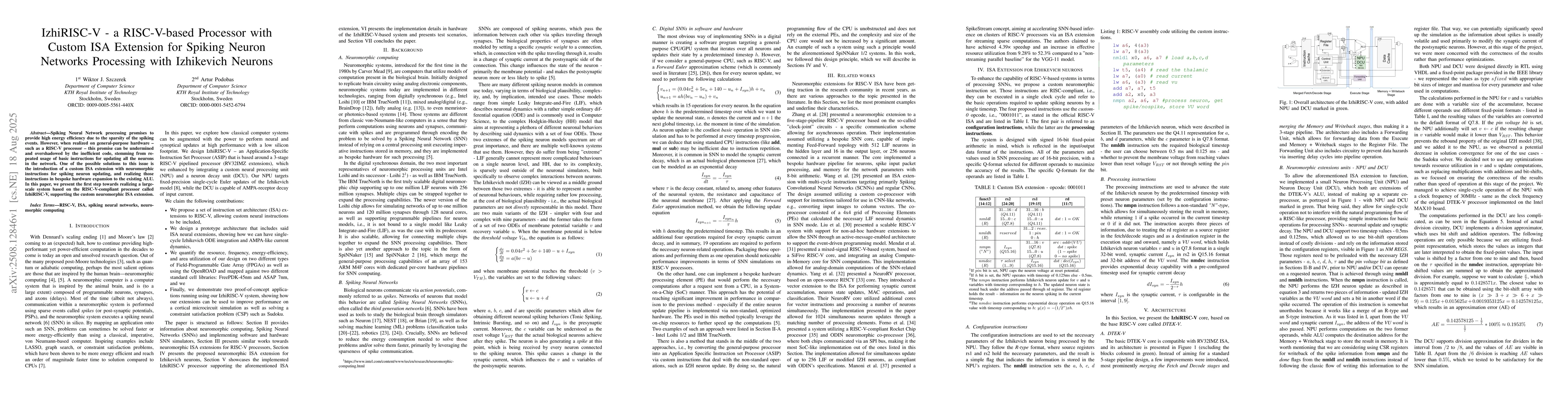 Spiking Neural Network processing promises to provide high energy efficiency due to the sparsity of the spiking events. However, when realized on general-purpose hardware -- such as a RISC-V processor -- this promise can be undermined and overshadowed by the inefficient code, stemming from repeated usage of basic instructions for updating all the neurons in the network. One of the possible solutions to this issue is the introduction of a custom ISA extension with neuromorphic instructions for spiking neuron updating, and realizing those instructions in bespoke hardware expansion to the existing ALU. In this paper, we present the first step towards realizing a large-scale system based on the RISC-V-compliant processor called IzhiRISC-V, supporting the custom neuromorphic ISA extension.