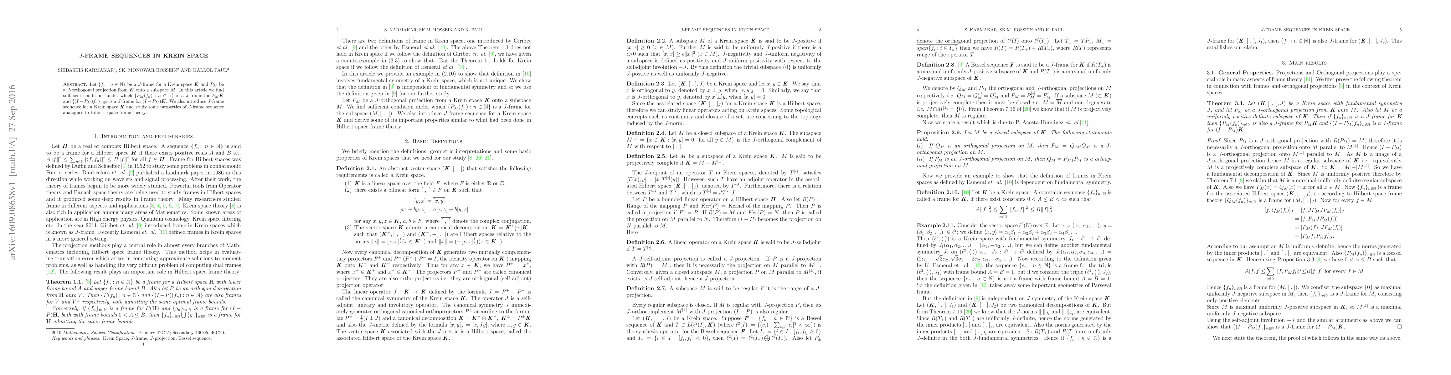 Let $\{f_n:n\in\mathbb{N}\}$ be a $J$-frame for a Krein space ${\textbf{\textit{K}}}$ and $P_M$ be a $J$-orthogonal projection from ${\textbf{\textit{K}}}$ onto a subspace $M$. In this article we find sufficient conditions under which $\{P_M(f_n):n\in\mathbb{N}\}$ is a $J$-frame for $P_M\textbf{\textit{K}}$ and $\{(I-P_M)f_n\}_{n\in{\mathbb{N}}}$ is a $J$-frame for $(I-P_M)\textbf{\textit{K}}$. We also introduce $J$-frame sequence for a Krein space ${\textbf{\textit{K}}}$ and study some properties of $J$-frame sequence analogues to Hilbert space frame theory.