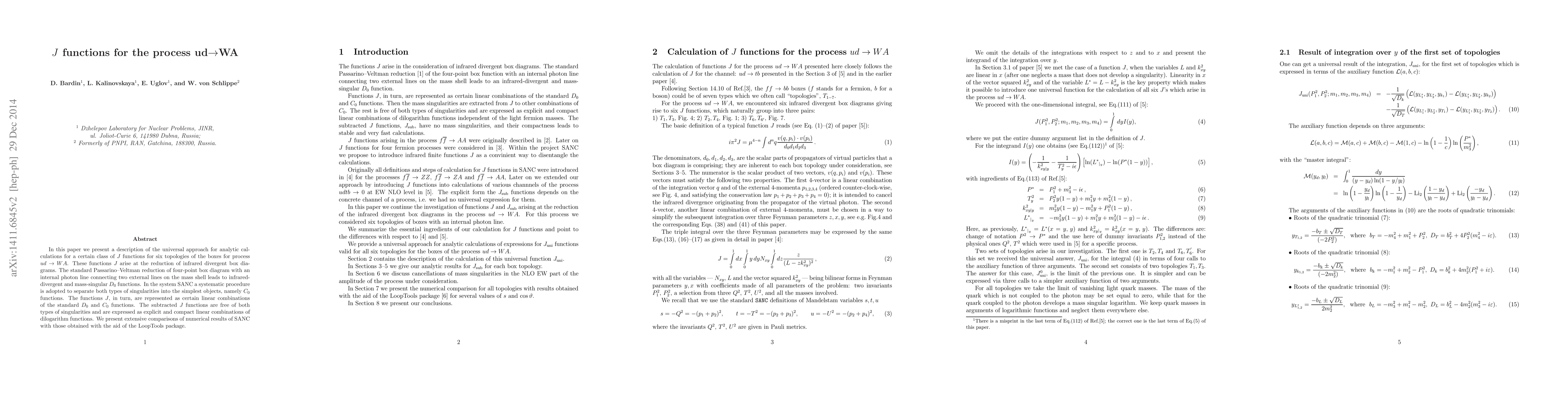 In this paper we present a description of the universal approach for analytic calculations for a certain class of $J$ functions for six topologies of the boxes for process $ud\rightarrow WA$. These functions $J$ arise at the reduction of infrared divergent box diagrams. The standard Passarino--Veltman reduction of four-point box diagram with an internal photon line connecting two external lines on the mass shell leads to infrared-divergent and mass-singular $D_0$ functions. In the system SANC a systematic procedure is adopted to separate both types of singularities into the simplest objects, namely $C_0$ functions. The functions $J$, in turn, are represented as certain linear combinations of the standard $D_0$ and $C_0$ functions. The subtracted $J$ functions are free of both types of singularities and are expressed as explicit and compact linear combinations of dilogarithm functions. We present extensive comparisons of numerical results of SANC with those obtained with the aid of the LoopTools package.
