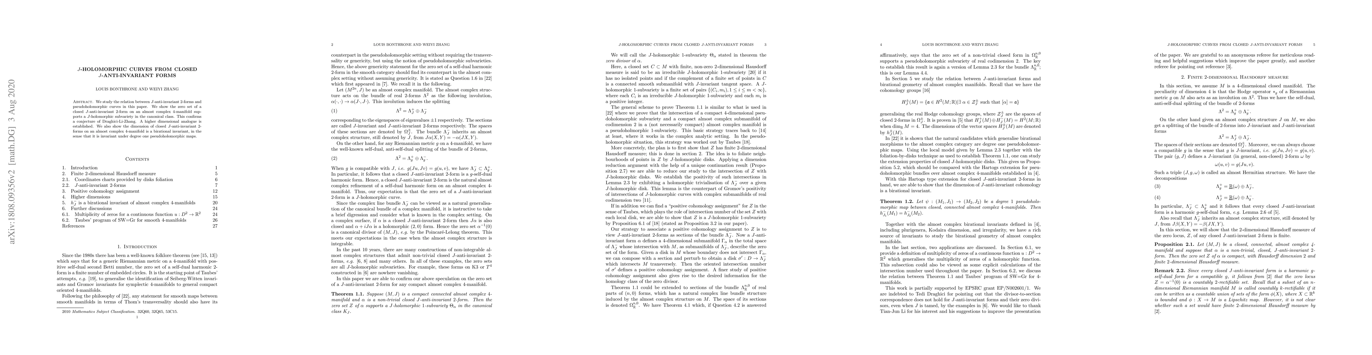 This paper explores the connection between $J$-anti-invariant $2$-forms and pseudoholomorphic curves, confirming a conjecture regarding the existence of $J$-holomorphic subvarieties supported by the zero set of closed $J$-anti-invariant $2$-forms on an almost complex $4$-manifold. Additionally, it establishes a higher-dimensional analogue and demonstrates that the dimension of these forms is a birational invariant.