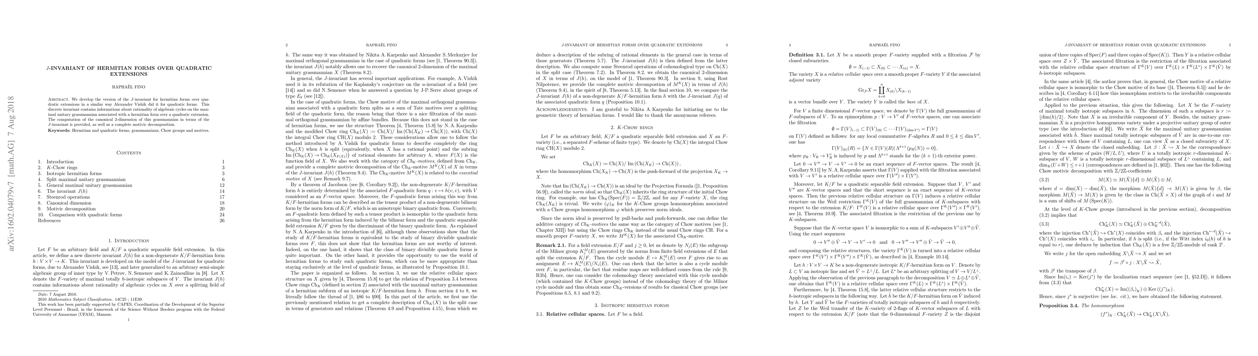 This paper introduces the $J$-invariant for hermitian forms over quadratic extensions, analogous to Alexander Vishik's work on quadratic forms, and provides a complete motivic decomposition. It also computes the canonical $2$-dimensionality of the associated maximal unitary grassmannian in terms of the $J$-invariant.
