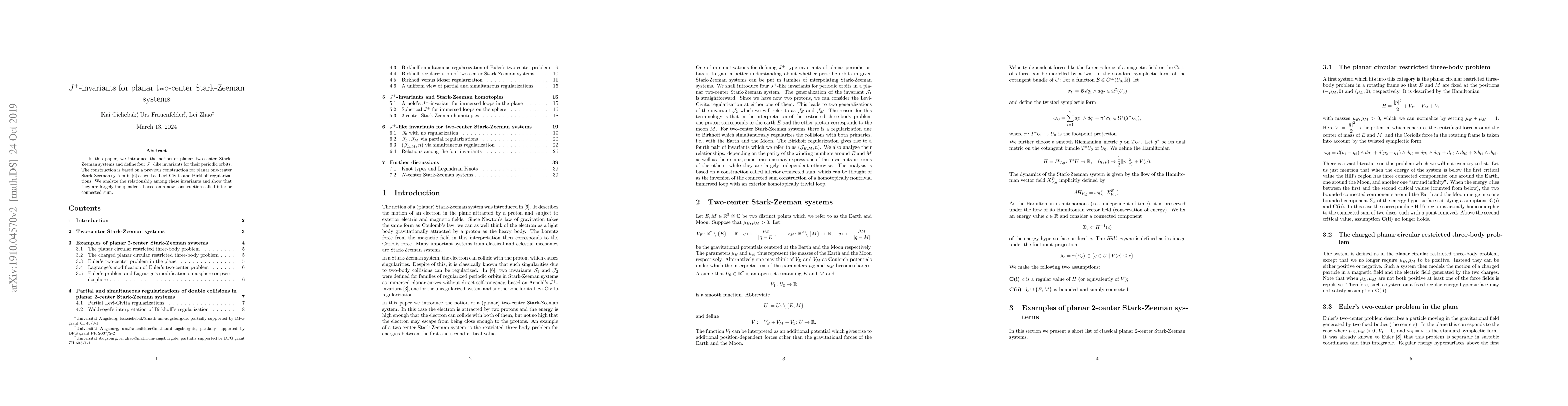 This paper introduces J+-invariants for planar two-center Stark-Zeeman systems, derived from a previous one-center system construction and Levi-Civita/Birkhoff regularizations. The invariants' relationships are analyzed, showing independence via a new interior connected sum method.