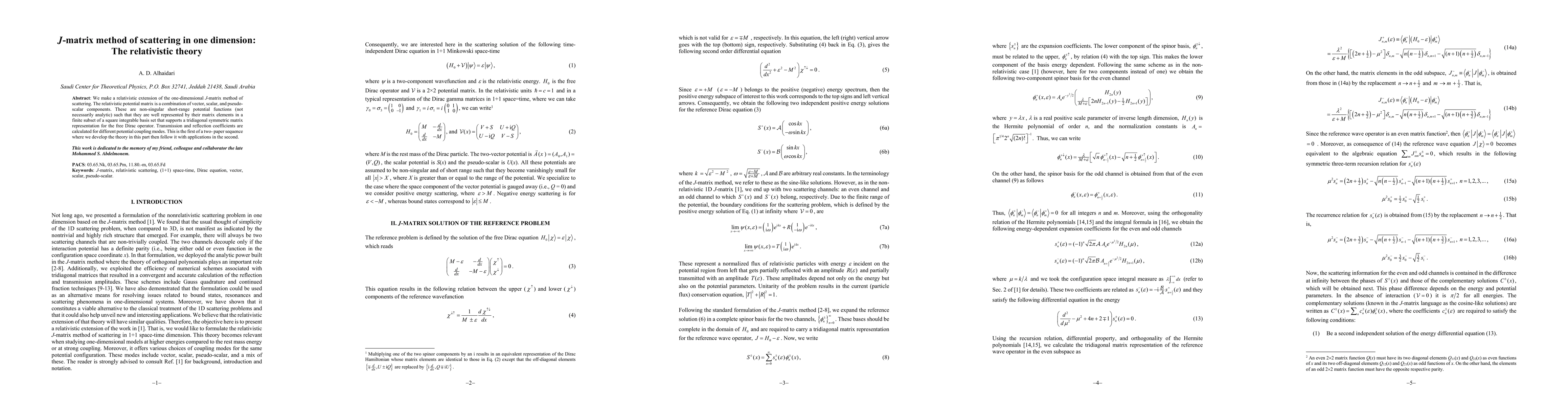 This paper extends the one-dimensional J-matrix method to relativistic scattering, incorporating vector, scalar, and pseudo-scalar potentials. Transmission and reflection coefficients are calculated for various potential coupling modes, providing a foundation for subsequent applications.