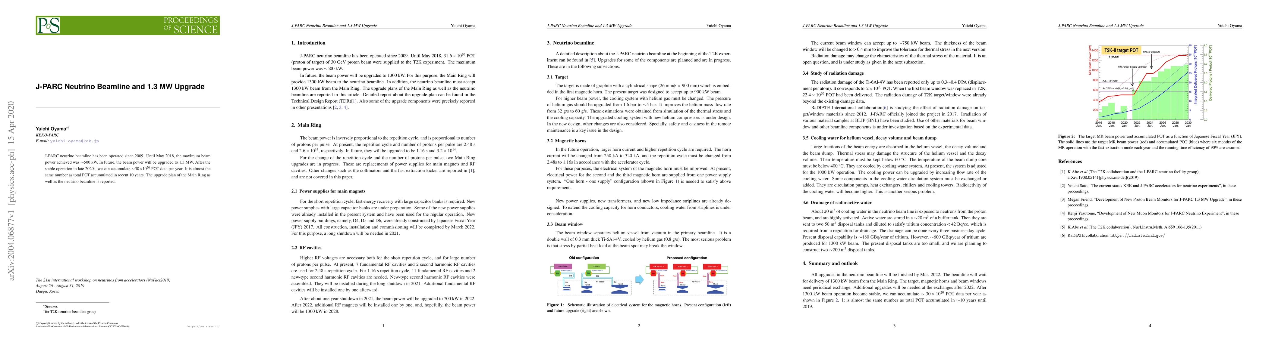 The J-PARC neutrino beamline, operational since 2009, will undergo a significant upgrade to 1.3 MW by the late 2020s, aiming to accumulate ~30 x 10^20 POT data annually, equivalent to a decade's worth of data. The upgrade includes enhancements to both the Main Ring and the neutrino beamline.