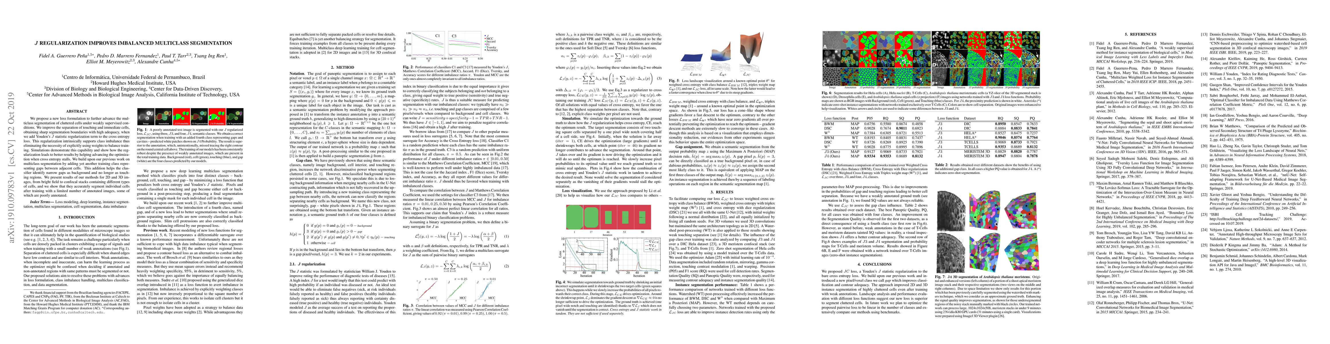 We propose a new loss formulation to further advance the multiclass segmentation of cluttered cells under weakly supervised conditions. We improve the separation of touching and immediate cells, obtaining sharp segmentation boundaries with high adequacy, when we add Youden's $J$ statistic regularization term to the cross entropy loss. This regularization intrinsically supports class imbalance thus eliminating the necessity of explicitly using weights to balance training. Simulations demonstrate this capability and show how the regularization leads to better results by helping advancing the optimization when cross entropy stalls. We build upon our previous work on multiclass segmentation by adding yet another training class representing gaps between adjacent cells. This addition helps the classifier identify narrow gaps as background and no longer as touching regions. We present results of our methods for 2D and 3D images, from bright field to confocal stacks containing different types of cells, and we show that they accurately segment individual cells after training with a limited number of annotated images, some of which are poorly annotated.