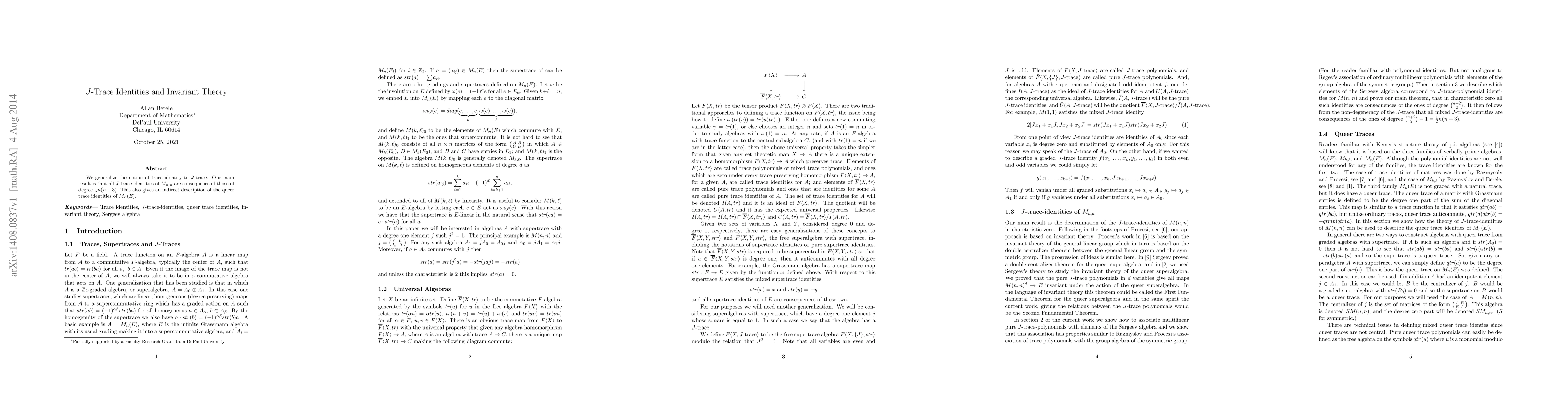 We generalize the notion of trace identity to $J$-trace. Our main result is that all $J$-traces of $M_{n,n}$ are consequence of those of degree $\frac12n(n + 3)$. This also gives an indirect description of the queer trace identities of $M_n(E)$.