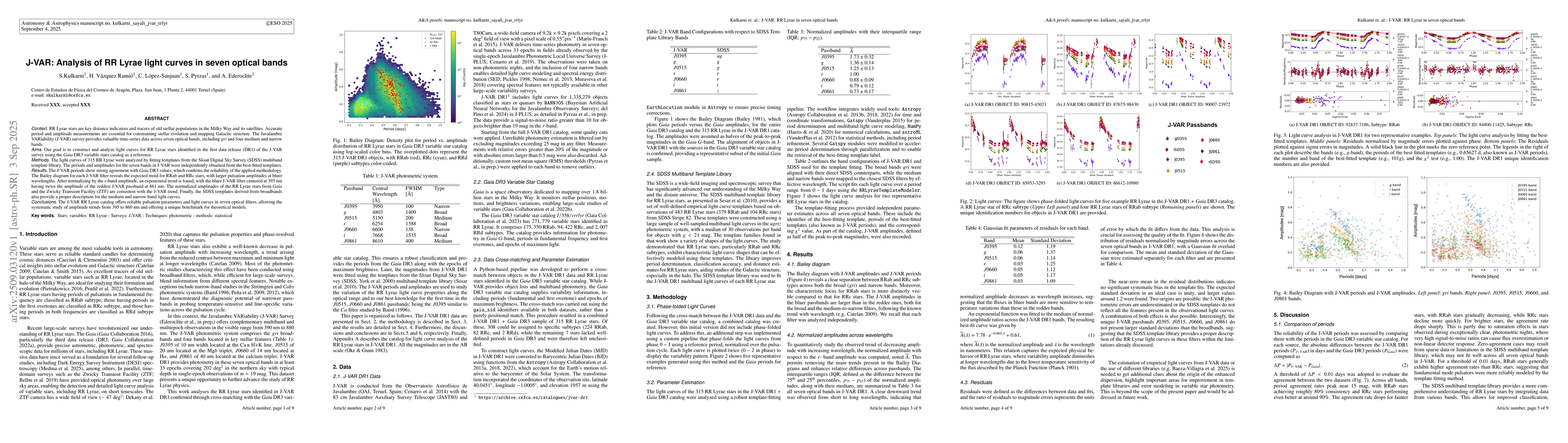 Context. RR Lyrae stars are key distance indicators and tracers of old stellar populations in the Milky Way and its satellites. Accurate period and amplitude measurements are essential for constraining stellar evolution and mapping Galactic structure. The Javalambre VARiability (J-VAR) survey provides valuable time-series data across seven optical bands, including gri and four medium and narrow bands. Aims. Our goal is to construct and analyze light curves for RR Lyrae stars identified in the first data release (DR1) of the J-VAR survey using the Gaia DR3 variable stars catalog as a reference. Methods. The light curves of 315 RR Lyrae were analyzed by fitting templates from the Sloan Digital Sky Survey (SDSS) multiband template library. The periods and amplitudes for the seven bands in J-VAR were independently obtained from the best-fitted templates. Results. The J-VAR periods show strong agreement with Gaia DR3 values, which confirms the reliability of the applied methodology. The Bailey diagram for each J-VAR filter reveals the expected trend for RRab and RRc stars, with larger pulsation amplitudes at bluer wavelengths. After normalizing by the r-band amplitude, an exponential trend is found, with the bluer J-VAR filter centered at 395 nm having twice the amplitude of the reddest J-VAR passband at 861 nm. The normalized amplitudes of the RR Lyrae stars from Gaia and the Zwicky Transient Facility (ZTF) are consistent with the J-VAR trend. Finally, the SDSS templates derived from broadbands also provide a proper description for the medium and narrow band light curves. Conclusions. The J-VAR RR Lyrae catalog offers reliable pulsation parameters and light curves in seven optical filters, allowing the systematic study of amplitude trends from 395 to 860 nm and offering a unique benchmark for theoretical models.