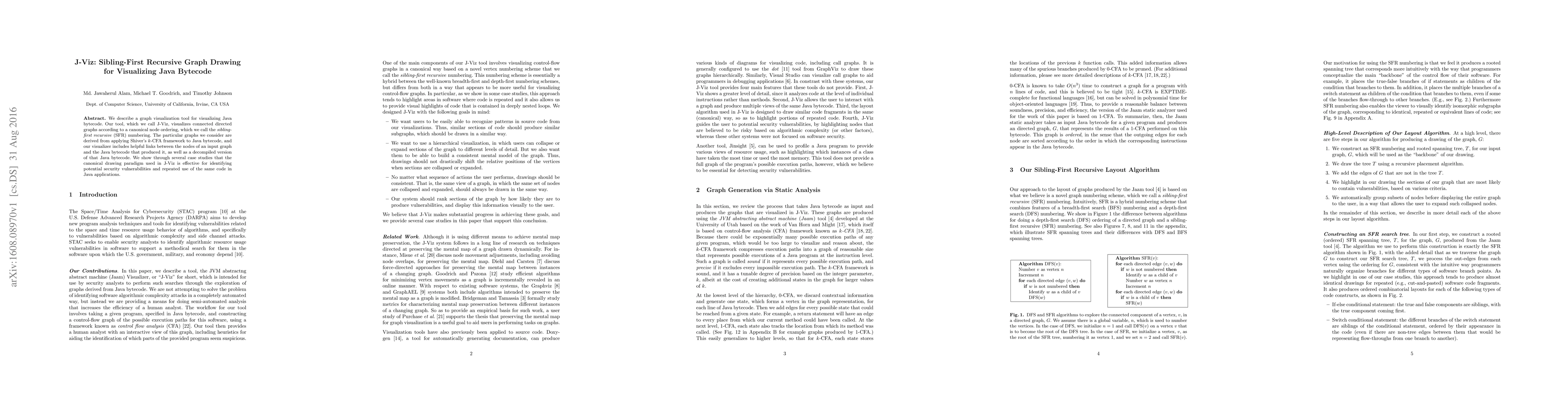 J-Viz is a graph visualization tool for Java bytecode that uses a sibling-first recursive numbering to create canonical directed graph drawings. It aids in identifying security vulnerabilities and code repetition by linking bytecode nodes to their Java source and decompiled versions.