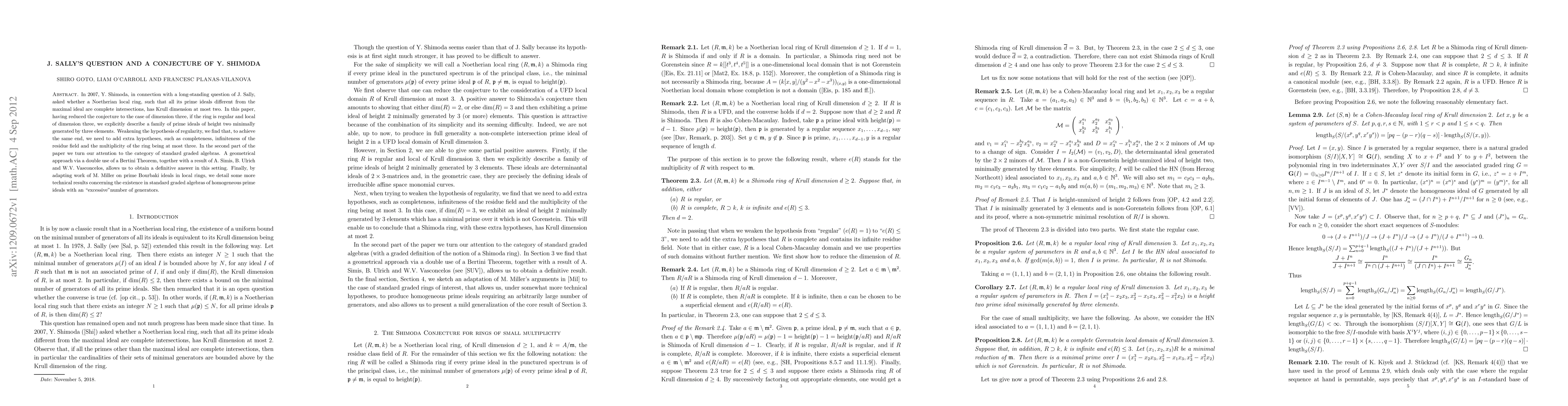 In 2007, Y. Shimoda, in connection with a long-standing question of J. Sally, asked whether a Noetherian local ring, such that all its prime ideals different from the maximal ideal are complete intersections, has Krull dimension at most two. In this paper, having reduced the conjecture to the case of dimension three, if the ring is regular and local of dimension three, we explicitly describe a family of prime ideals of height two minimally generated by three elements. Weakening the hypothesis of regularity, we find that, to achieve the same end, we need to add extra hypotheses, such as completeness, infiniteness of the residue field and the multiplicity of the ring being at most three. In the second part of the paper we turn our attention to the category of standard graded algebras. A geometrical approach via a double use of a Bertini Theorem, together with a result of A. Simis, B. Ulrich and W.V. Vasconcelos, allows us to obtain a definitive answer in this setting. Finally, by adapting work of M. Miller on prime Bourbaki ideals in local rings, we detail some more technical results concerning the existence in standard graded algebras of homogeneous prime ideals with an "excessive" number of generators.